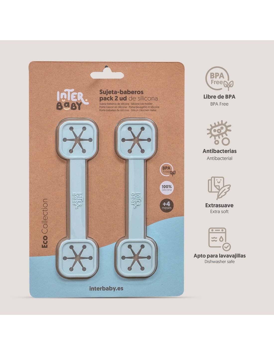 Práctico sujeta babero fabricado en silicona. Transforma una simple servilleta o pañuelo en un improvisado babero. APck de 2 unidades para llevarlos en tu bolso o caarrito al salir de casa. Suave y delicado con el cuello de tu bebé. Apto para lavavajillas. Libre de BPA, PVC y ftalatos.
