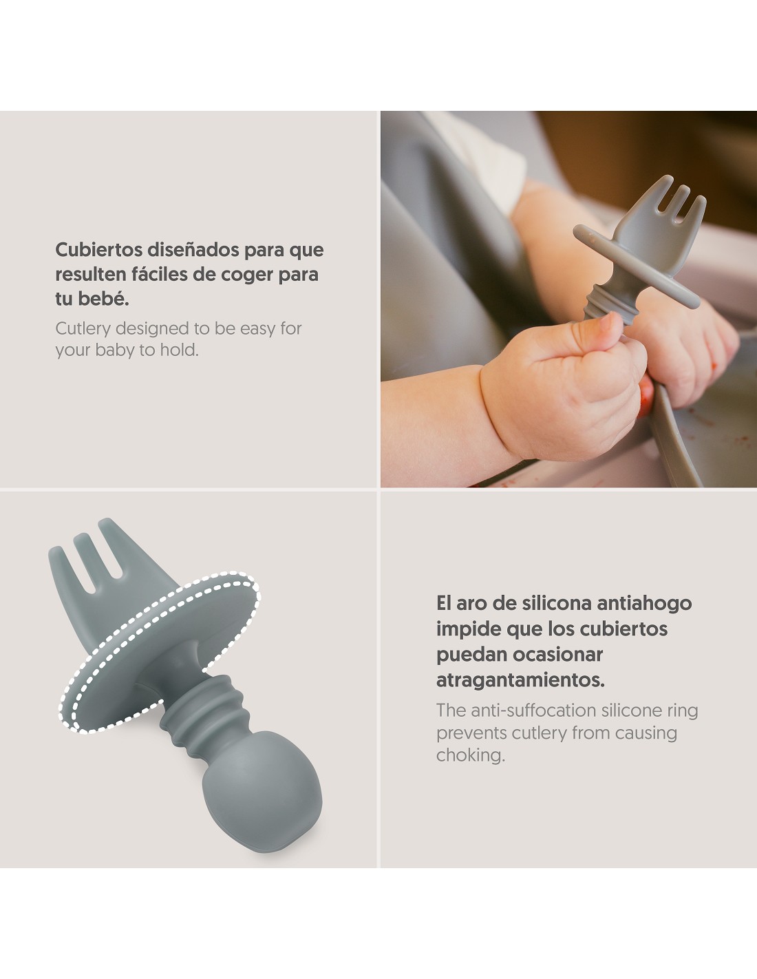 Cubiertos diseñados para que tu bebé aprenda a usar cubiertos con ellosganará confianza y disfrutará con su aprendizaje. Incorporan un aro de silicona que impide el atragantamiento de tu bebé. Apto para lavavajillas. Libre de BPA, PVC y ftalatos.
