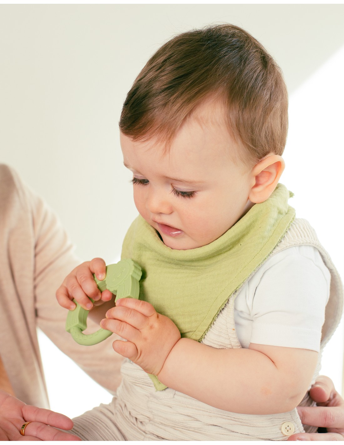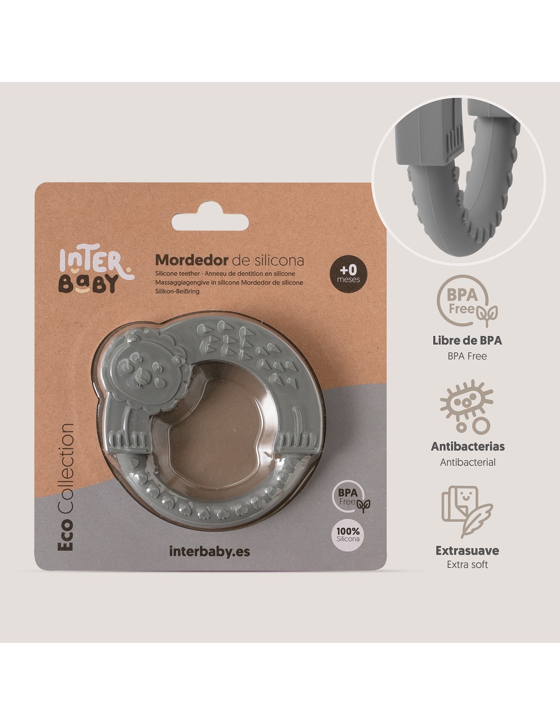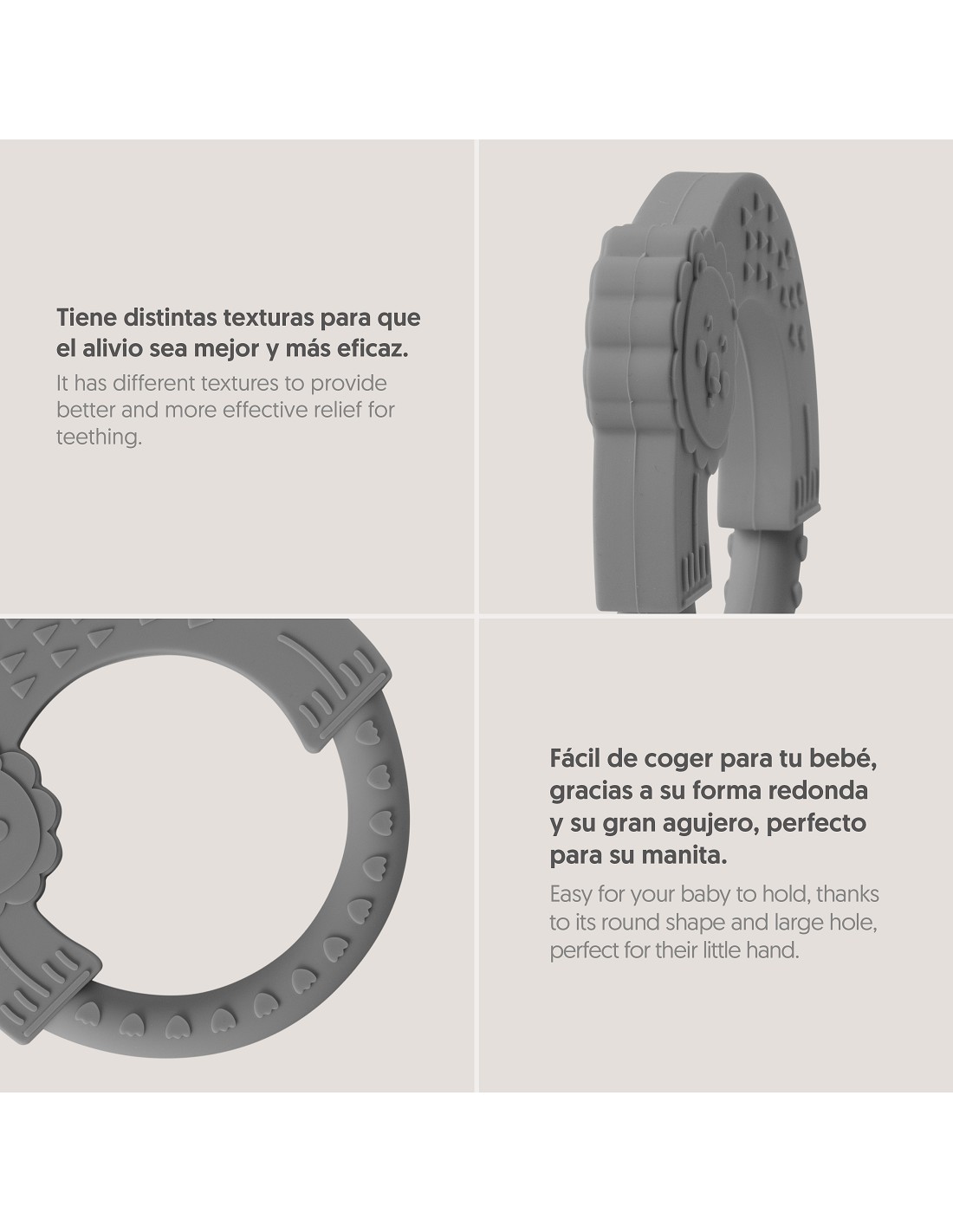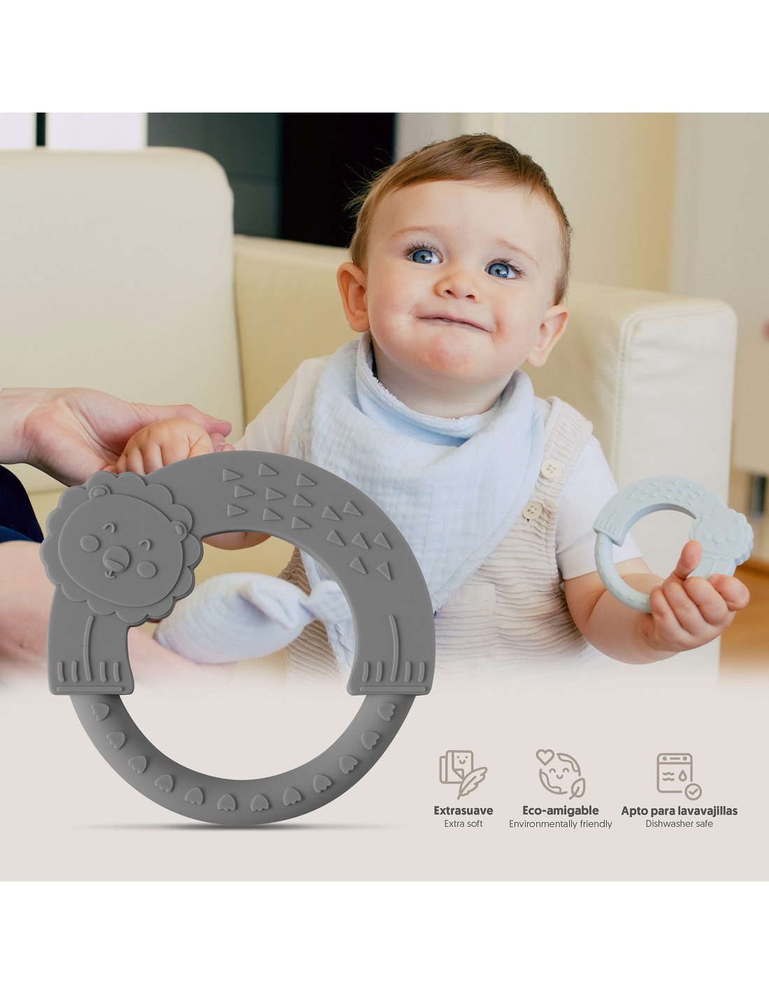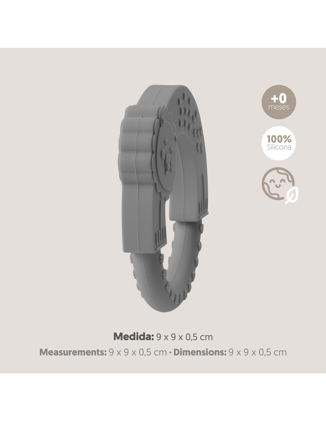 Mordedor de silicona con forma de león, fabrizado en silicona alimentaria. Ideal en su período de dentición. Apto para lavavajillas. Libre de BPA, PVC y ftalatos.