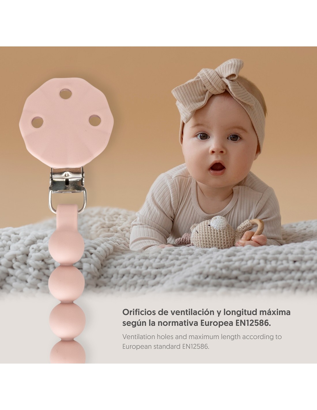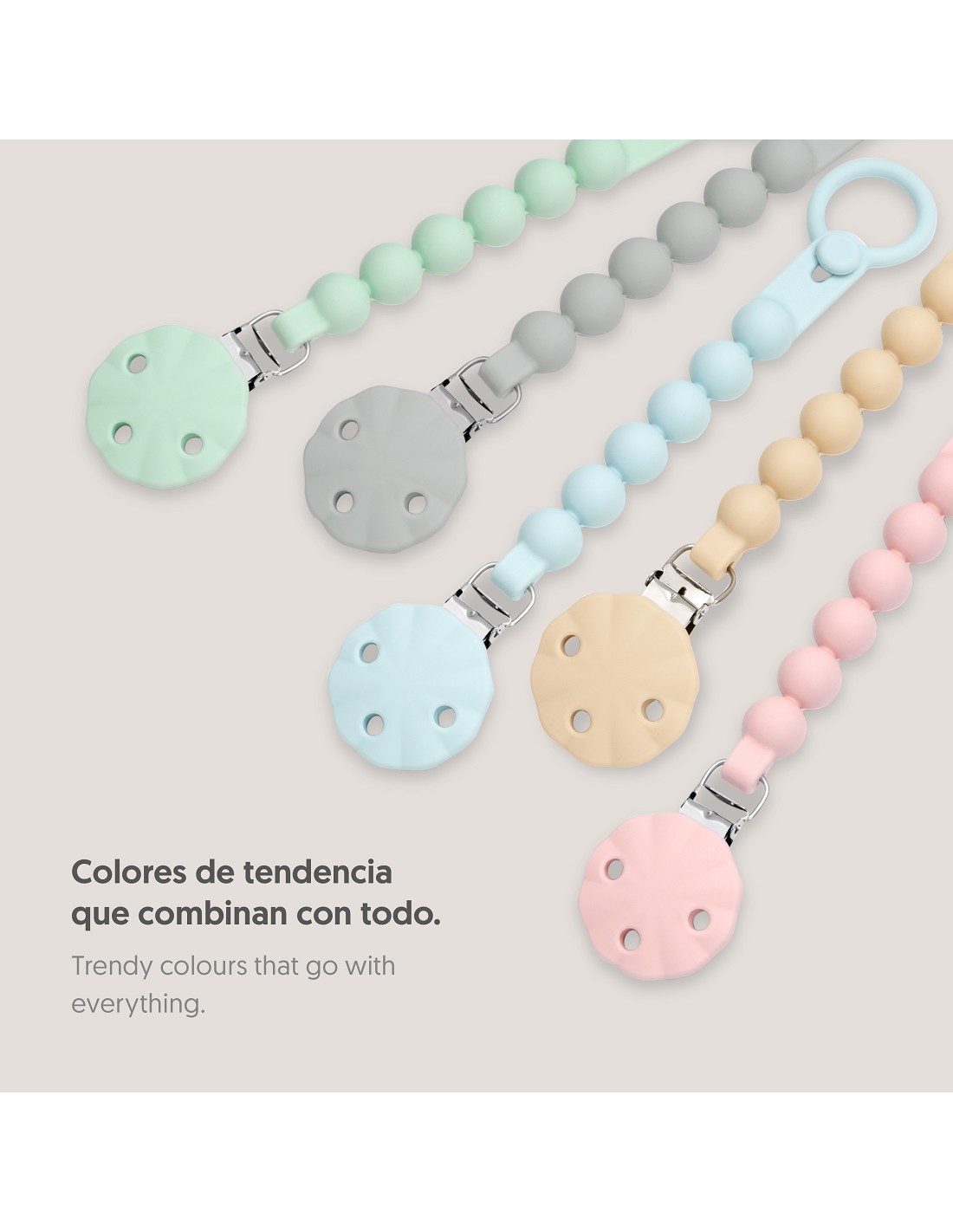 Chupetero tipo cadena fabricado en silicona alimentaria 100 % segura, ideal para el cuidado de tu bebe. No incluye el chupete. Apto para lavavajillas. Libre de BPA, PVC y ftalatos.