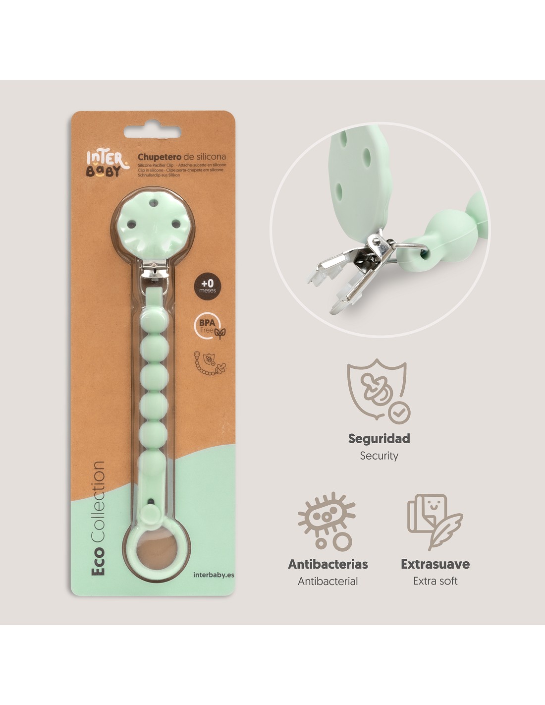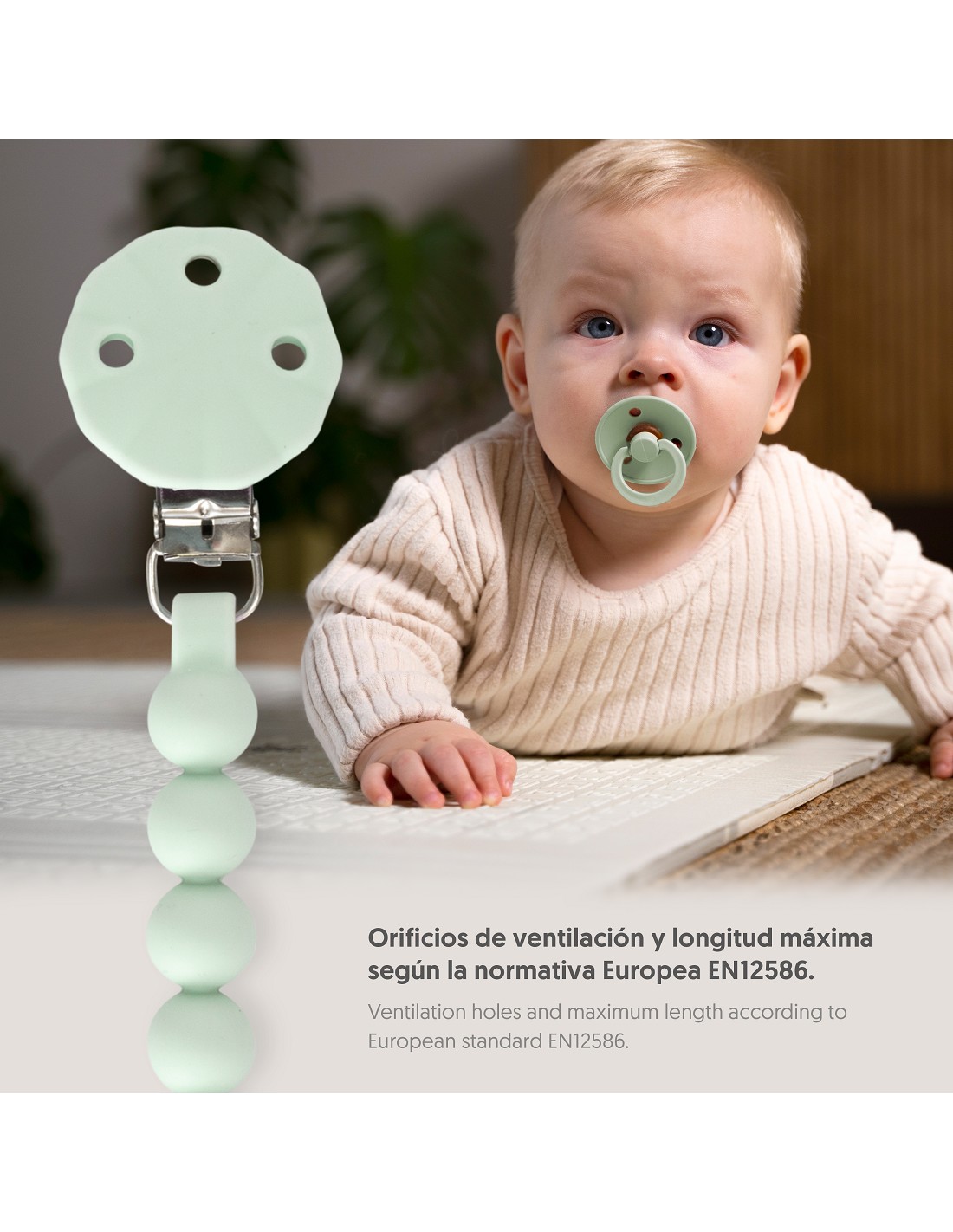 Chupetero tipo cadena fabricado en silicona alimentaria 100 % segura, ideal para el cuidado de tu bebe. No incluye el chupete. Apto para lavavajillas. Libre de BPA, PVC y ftalatos.
