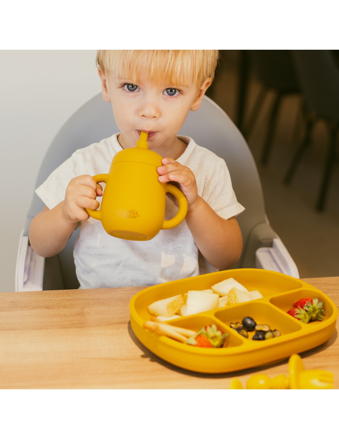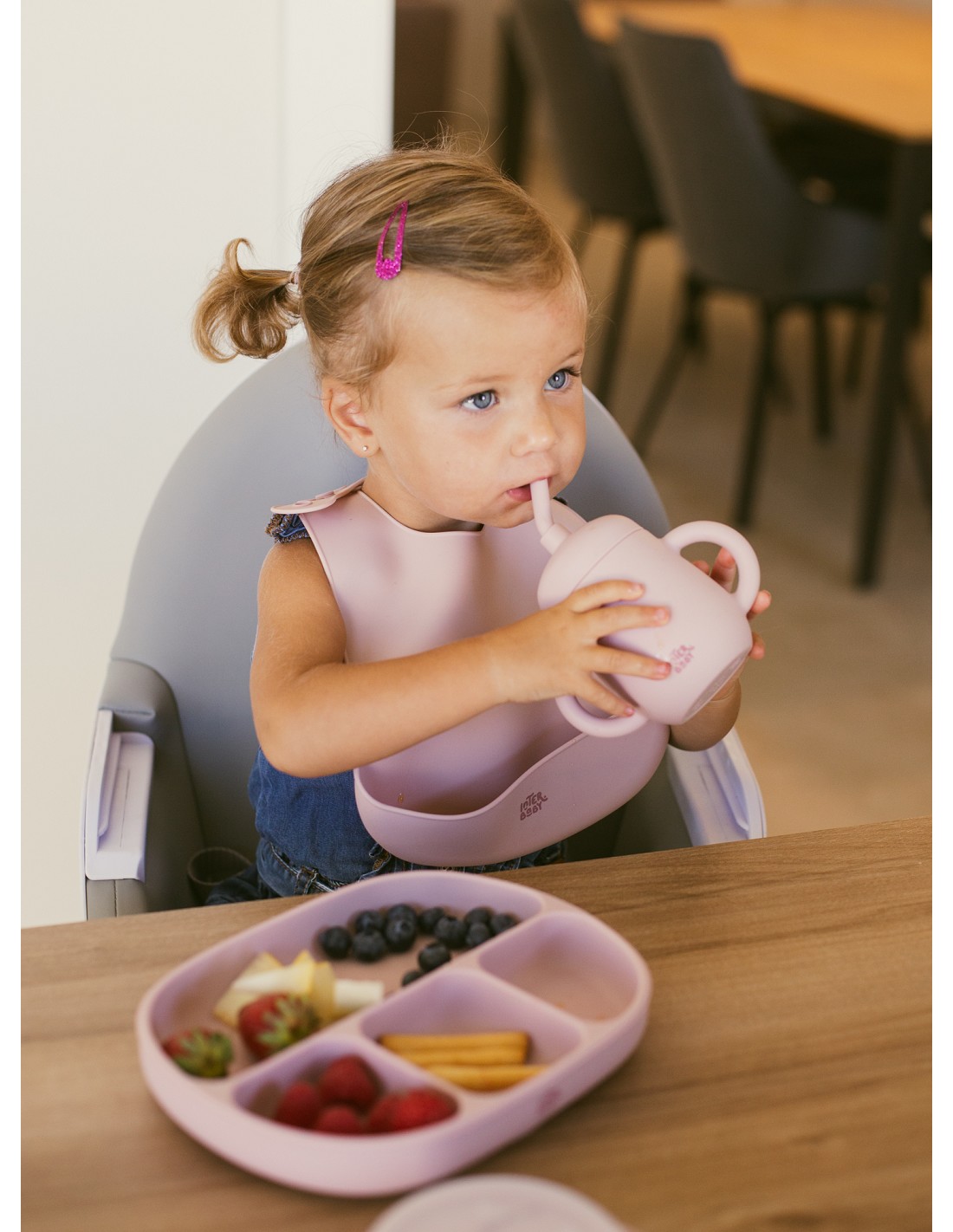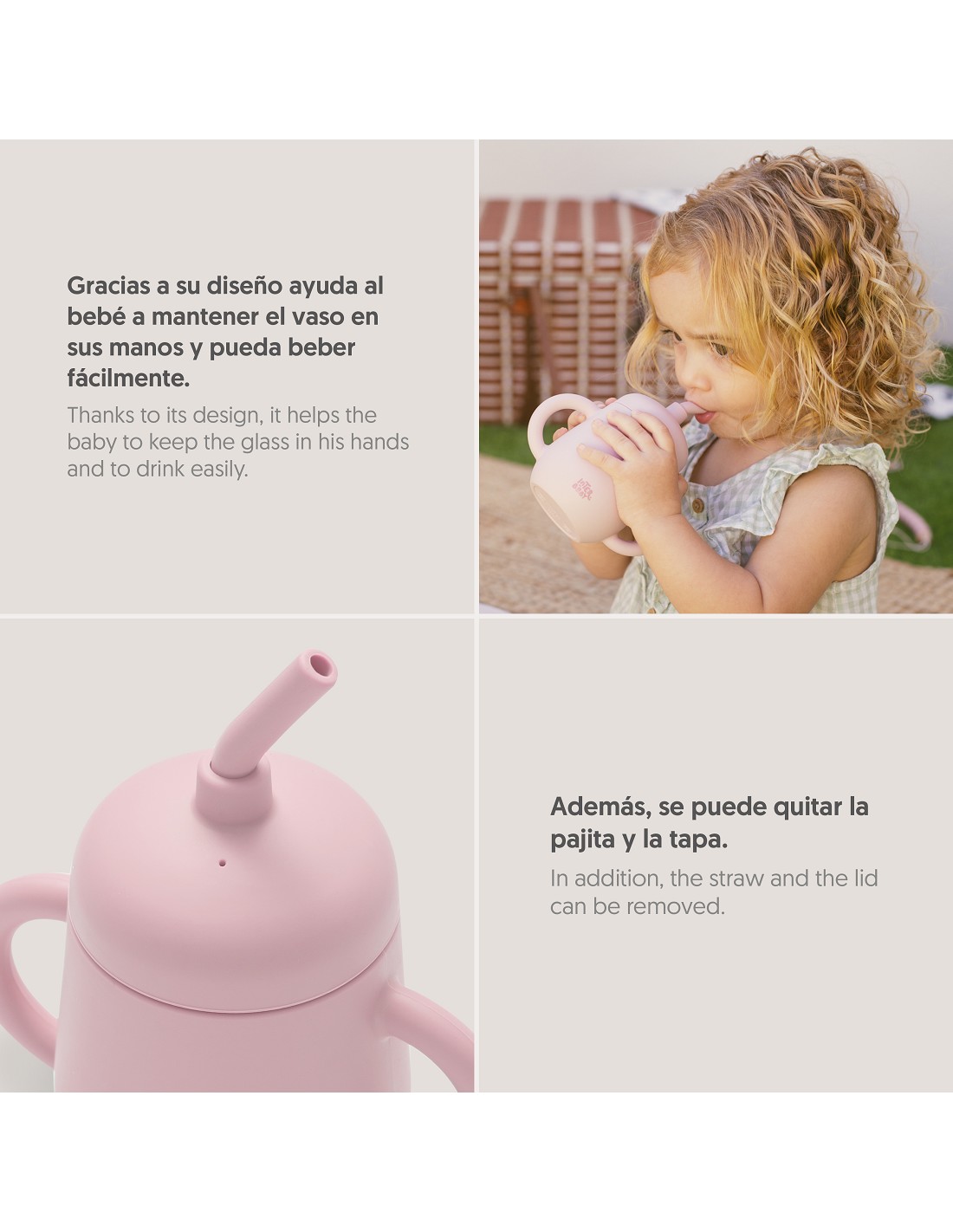 Vaso antigoteo que incuye pajita para ayudar a tu bebé a una mejor absorción de liquidos y evitar derrames. Ayuda a tu bebé a mantener el vaso en sus manos facilitándole la ingesta de liquidos. Pajita y tapita desmontables. Libre de posibles infecciones al estar fabricado en silicona libre de BPA, PVC, Vinilo, Plomo y ftalatos. Apto para lavavajillas.