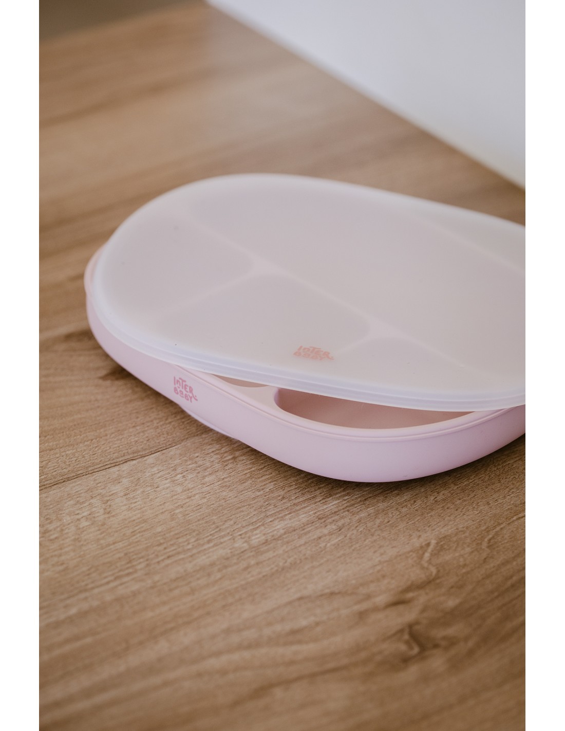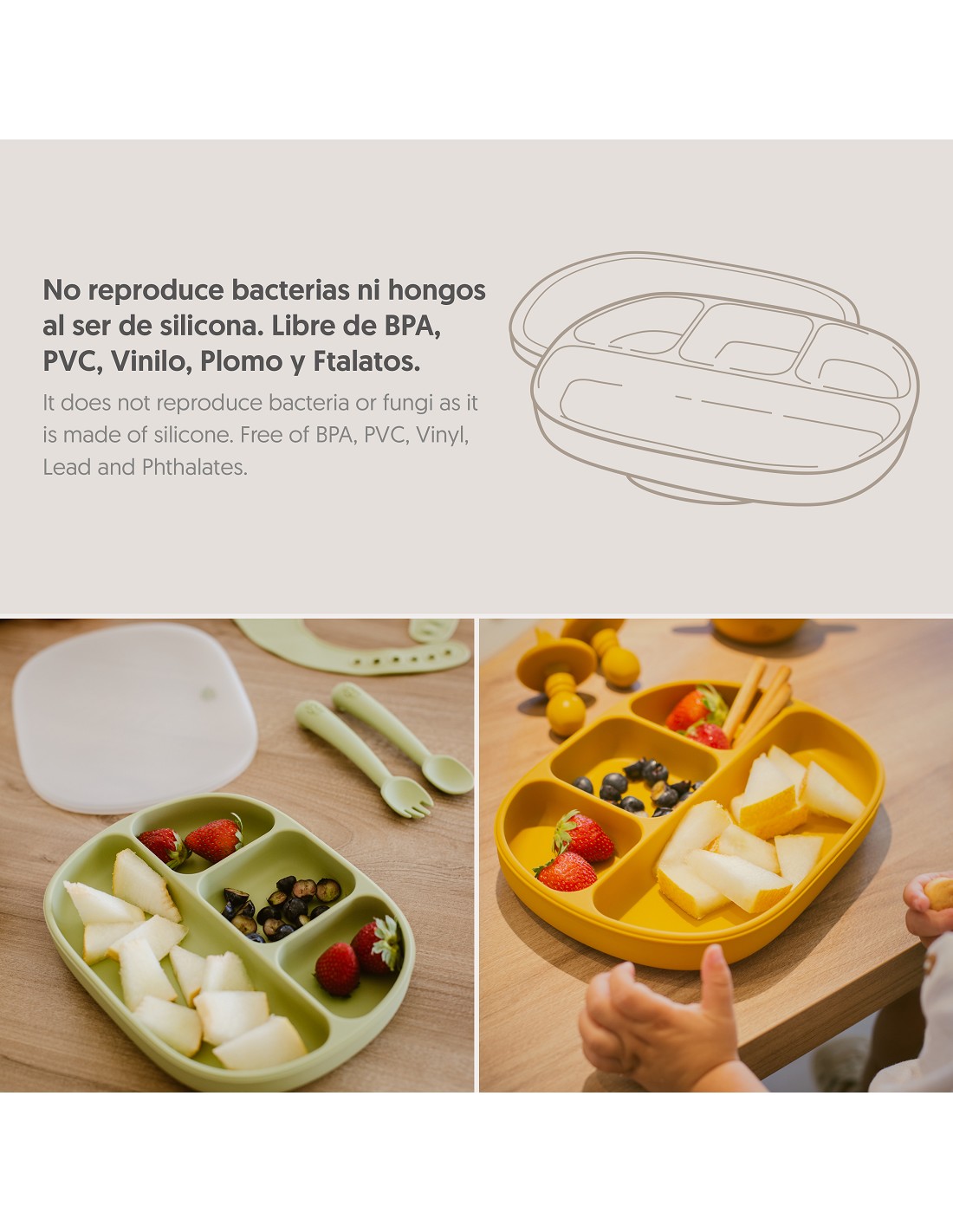 Plato de silicona que incorpora ventosas para eviatr accidentes. Dispone de 4 divisores para separar los distintos tipos de comida y que tu bebé experimente de manera individual el sabor y la textura de cada uno de ellos. Incluye tapadera para mejor conservación de la comida. Fácil limpieza y muy resistente. Libre de posibles infecciones al estar fabricado en silicona libre de BPA, PVC, Vinilo, Plomo y ftalatos. Apto para lavavajillas.