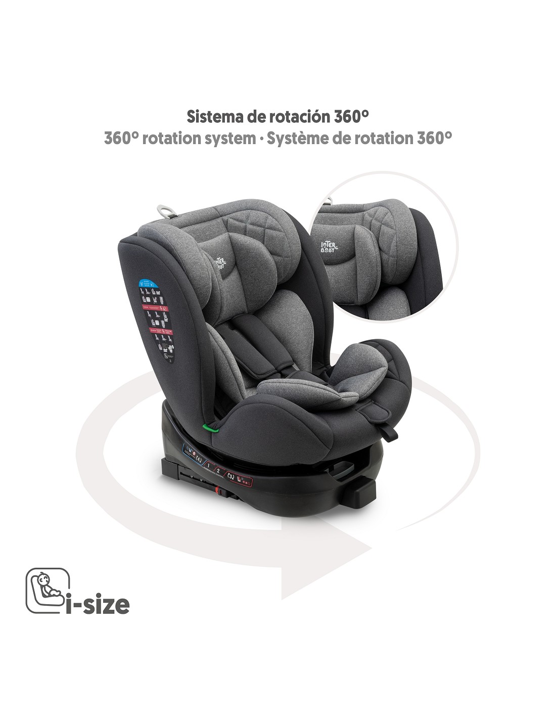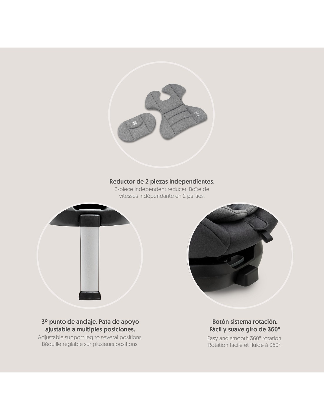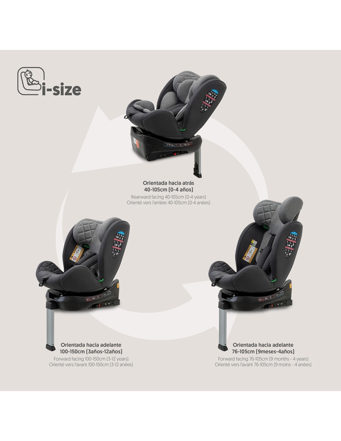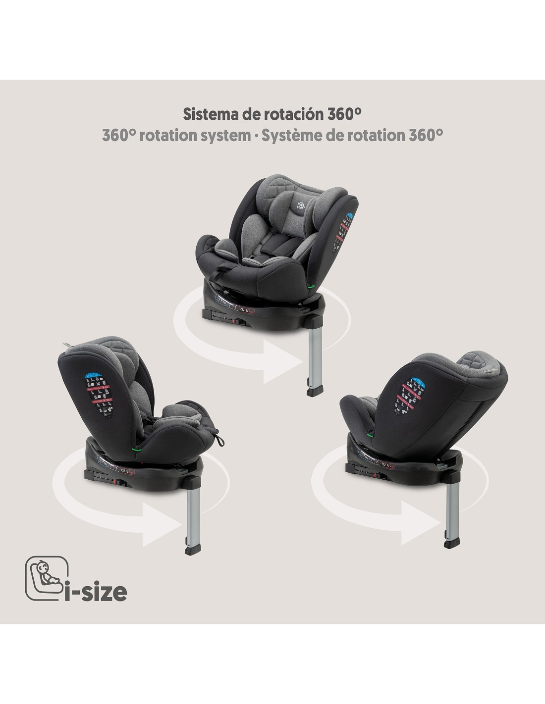 Silla Auto para bebes. Giro de 360 º. Soporta hasta 15 kg . Amplios sitemas de seguridad. Cumple la norma i-size. Evolutiva con reductor incluido. Apta de los 0 a 12 años