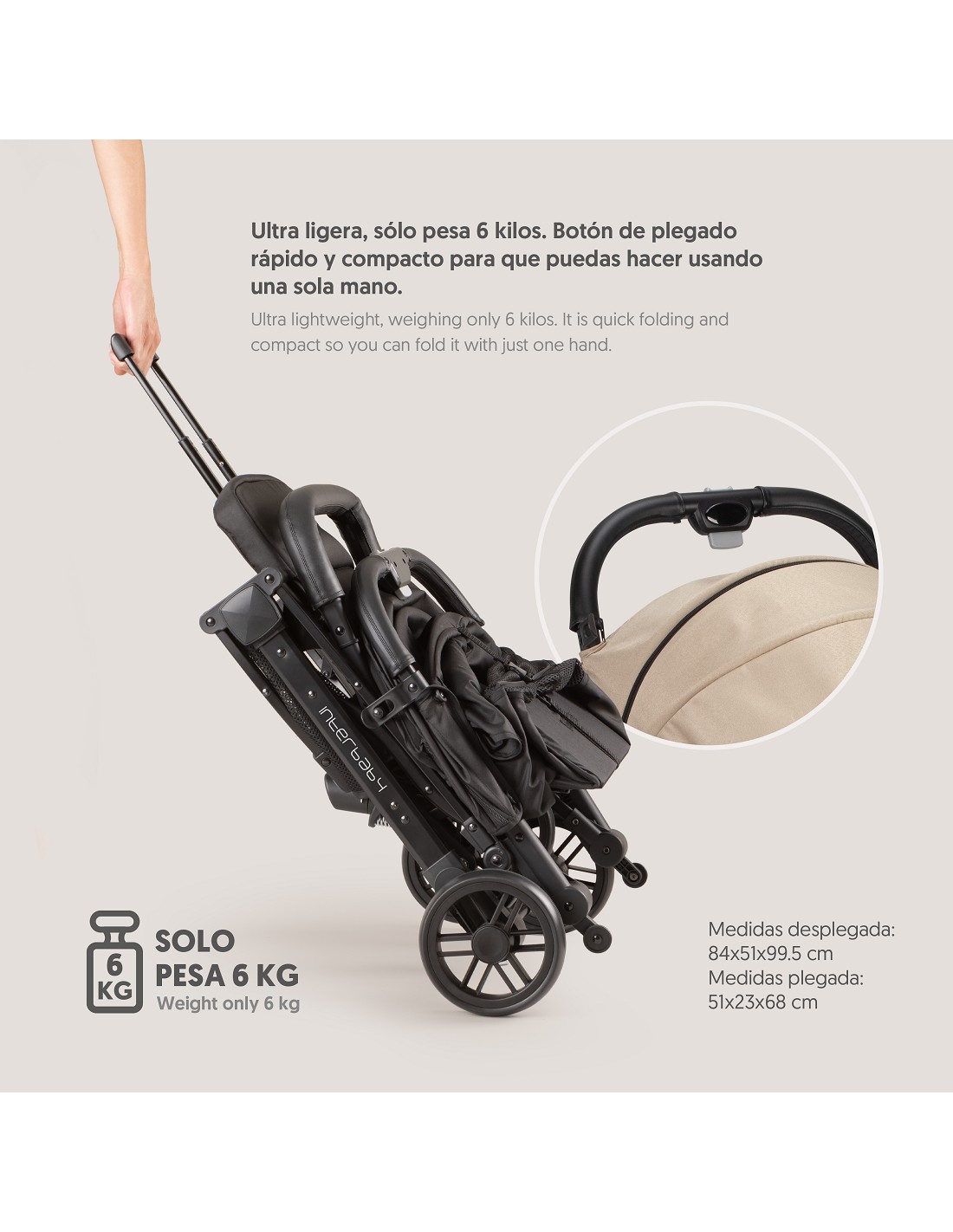 Silla Paseo de 0 a 48 meses. Hasta 22 kg de peso. Fácil transporte con tirador. Incluye bolsa de viaje y burbuja luvia. Doble capota intercambiable. Botón de plegado. Manillar y reposabrazos de polipiel. Amortiguación para mayor comodidad del bebé. Capota XXL totalmente reclinable y cubrelluvia.