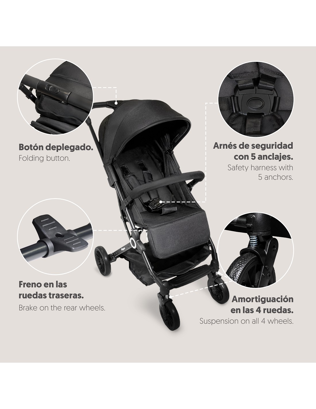 Silla Paseo de 0 a 48 meses. Hasta 22 kg de peso. Fácil transporte con tirador. . Botón de plegado. Manillar y reposabrazos. Amortiguación para mayor comodidad del bebé. Capota XXL totalmente reclinable y cubrelluvia.