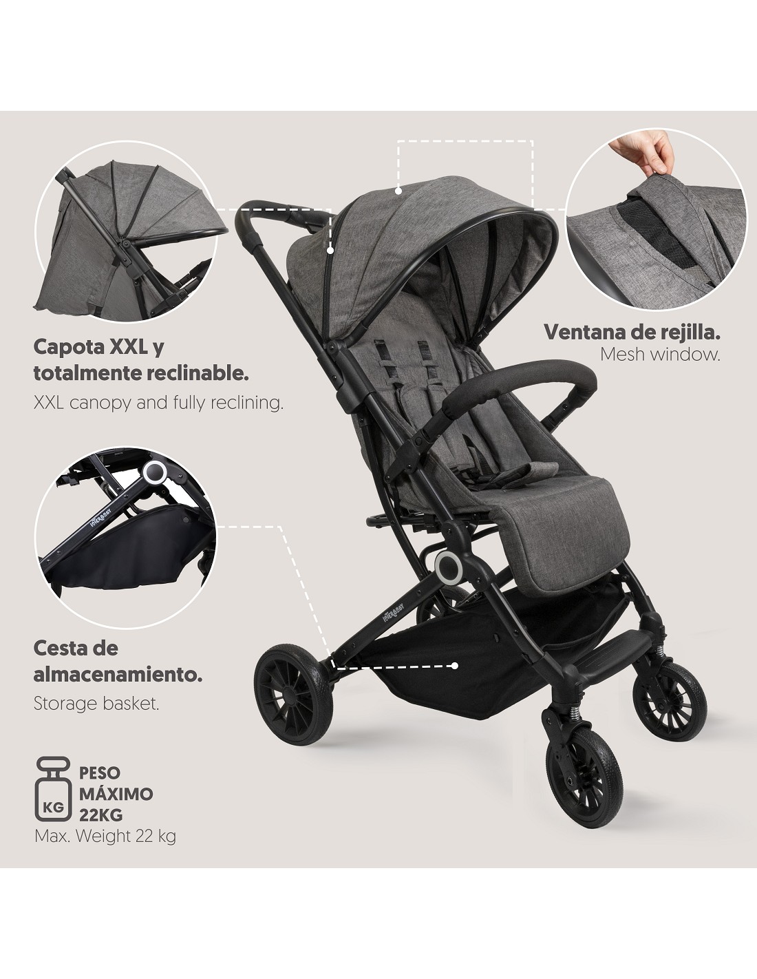 Silla Paseo de 0 a 48 meses. Hasta 22 kg de peso. Fácil transporte con tirador. . Botón de plegado. Manillar y reposabrazos. Amortiguación para mayor comodidad del bebé. Capota XXL totalmente reclinable y cubrelluvia.