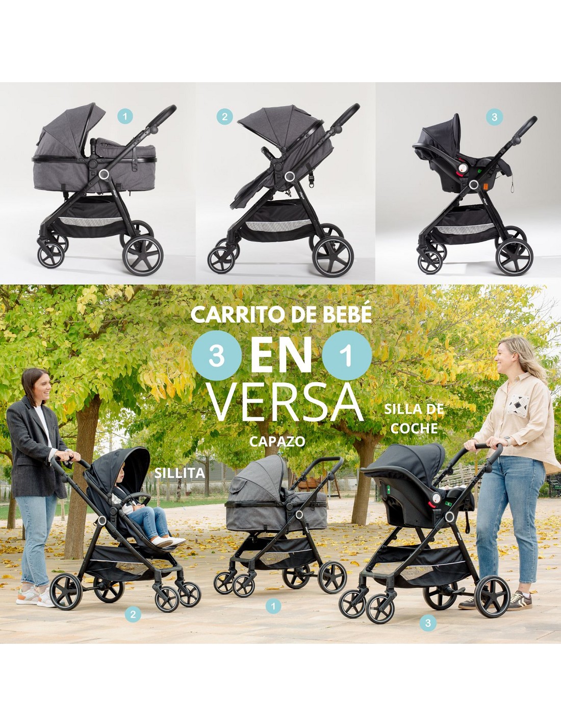 Carro de Paseo 3 En 1 Capazo+Silla+Grupo 0 Modelo Versa Negro
