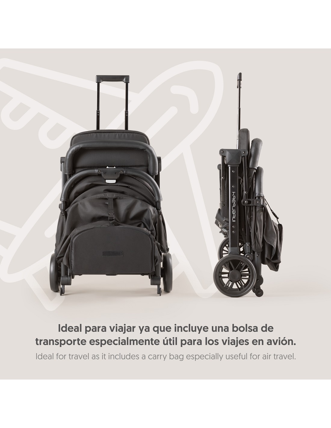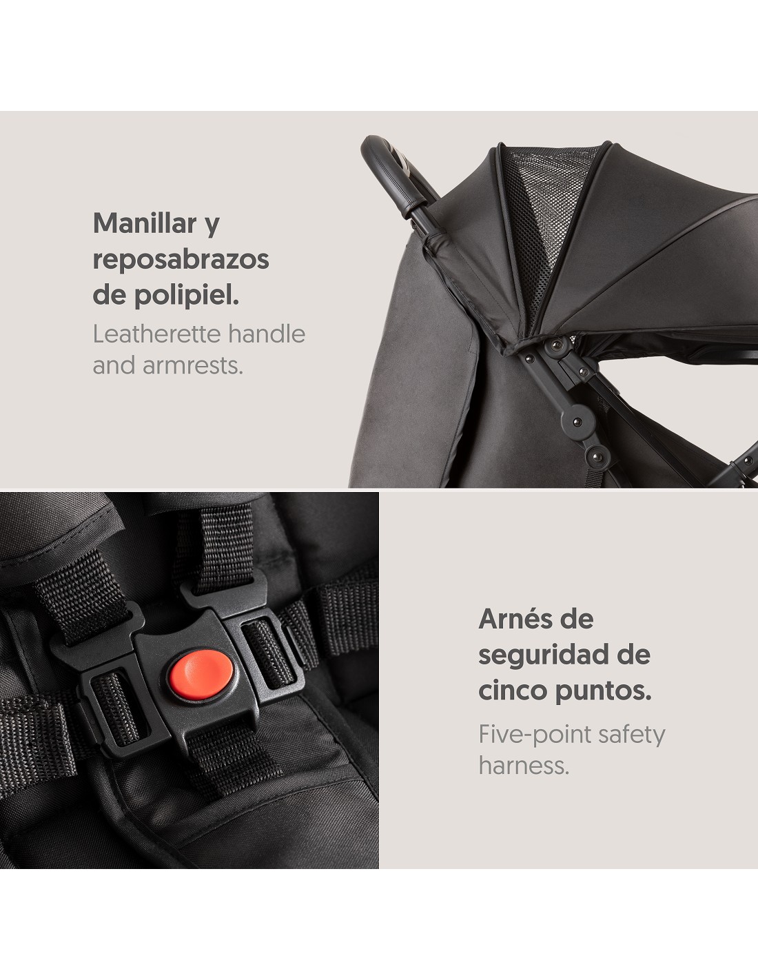 Silla Paseo de 0 a 48 meses. Hasta 22 kg de peso. Fácil transporte con tirador. Incluye bolsa de viaje y burbuja luvia. Doble capota intercambiable. Botón de plegado. Manillar y reposabrazos de polipiel. Amortiguación para mayor comodidad del bebé. Capota XXL totalmente reclinable y cubrelluvia.