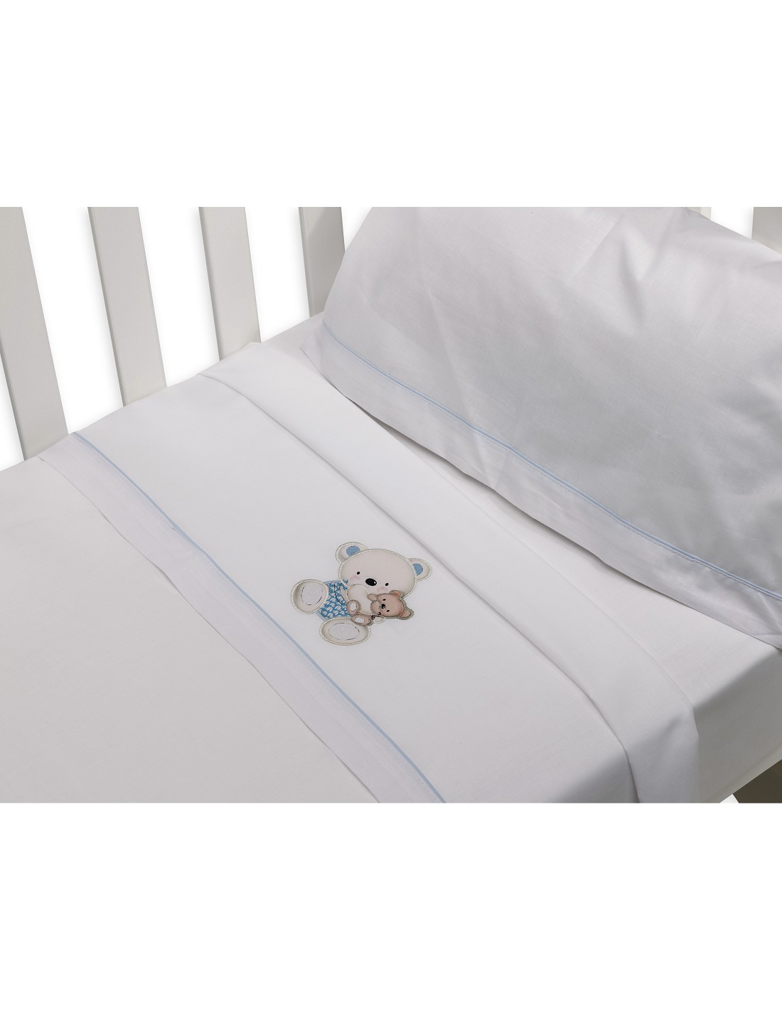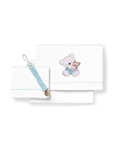 Compuesto por encimera (103 x 150 cm) , bajera (60 x 120 cm) y funda de almohada (60 x 30 cm). 100 % algodón. Lavar en frío.