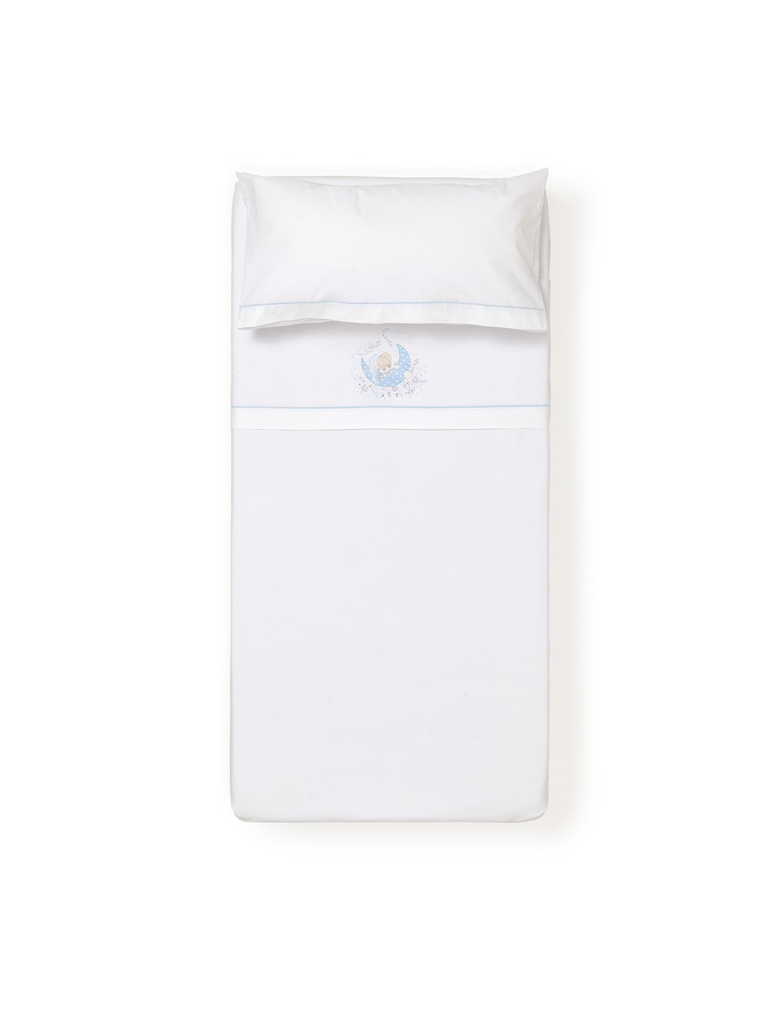 Compuesto por encimera (103 x 150 cm) , bajera (60 x 120 cm) y funda de almohada (60 x 30 cm). 100 % algodón. Lavar en frío.