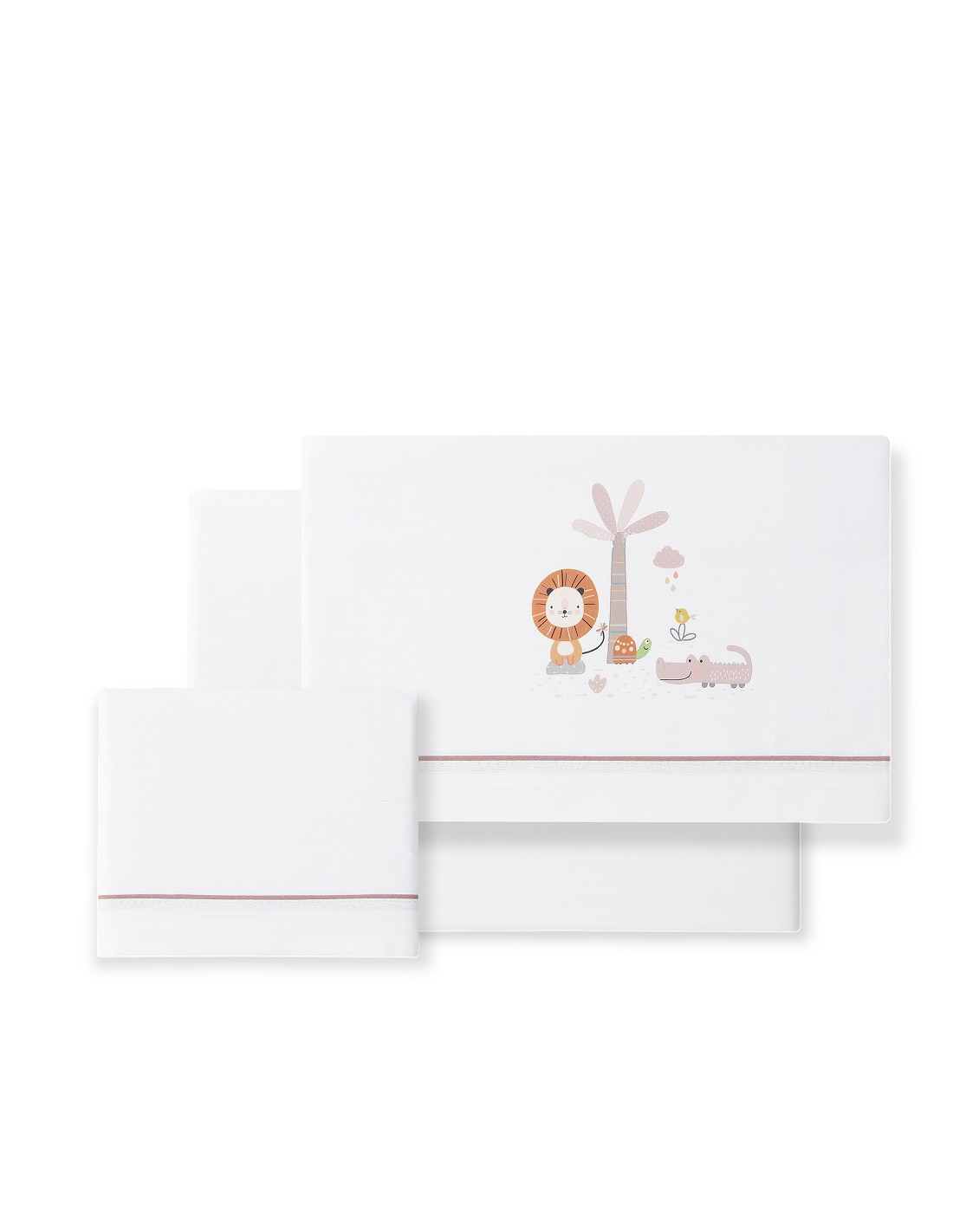 Compuesto por encimera (103 x 150 cm) , bajera (60 x 120 cm) y funda de almohada (60 x 30 cm). 100 % algodón. Lavar en frío.