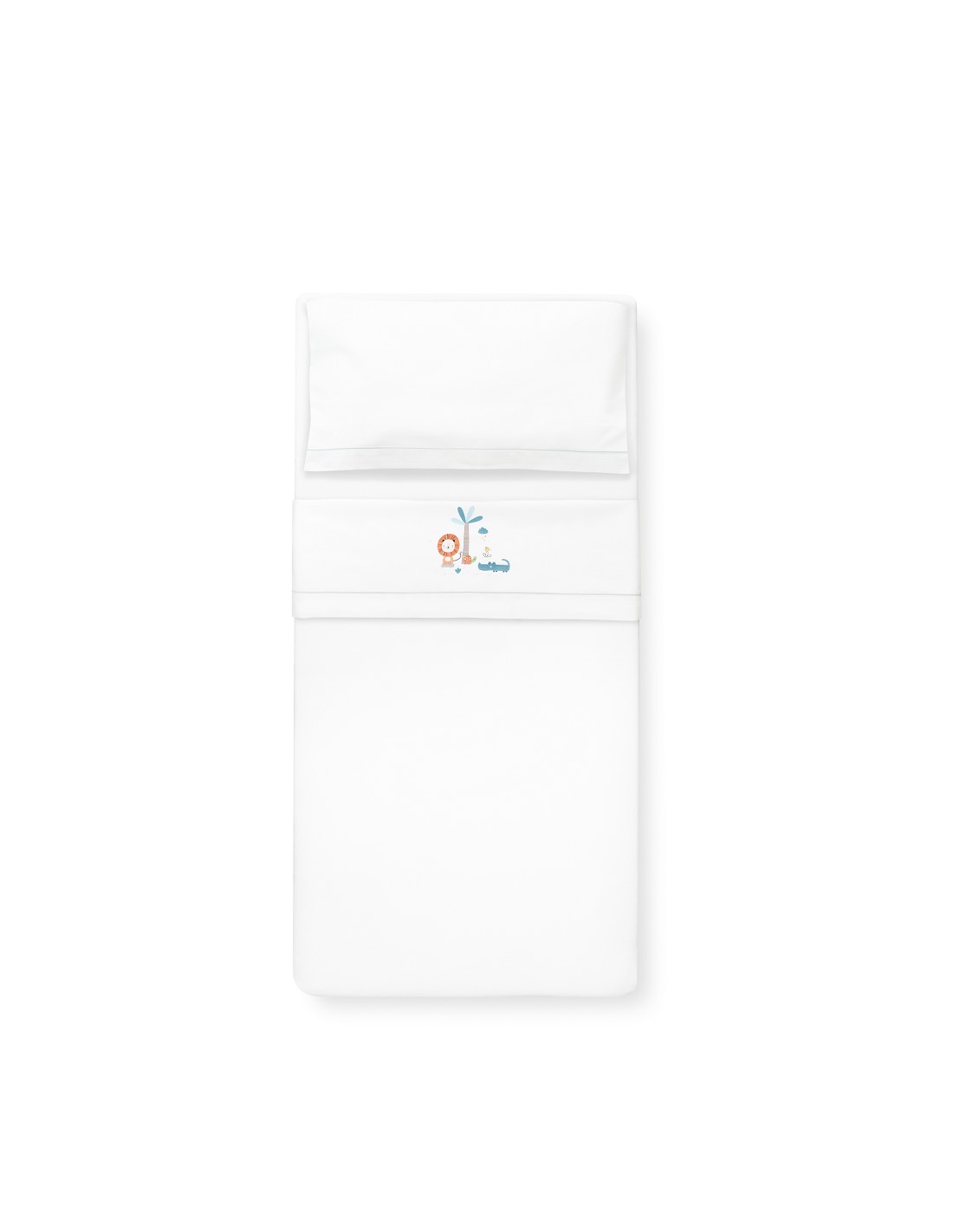Compuesto por encimera (103 x 150 cm) , bajera (60 x 120 cm) y funda de almohada (60 x 30 cm). 100 % algodón. Lavar en frío.