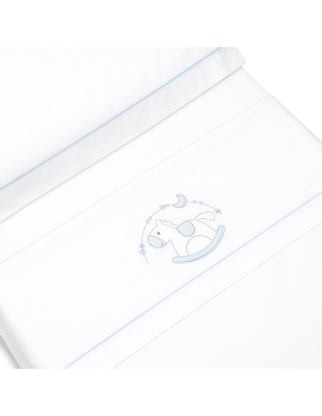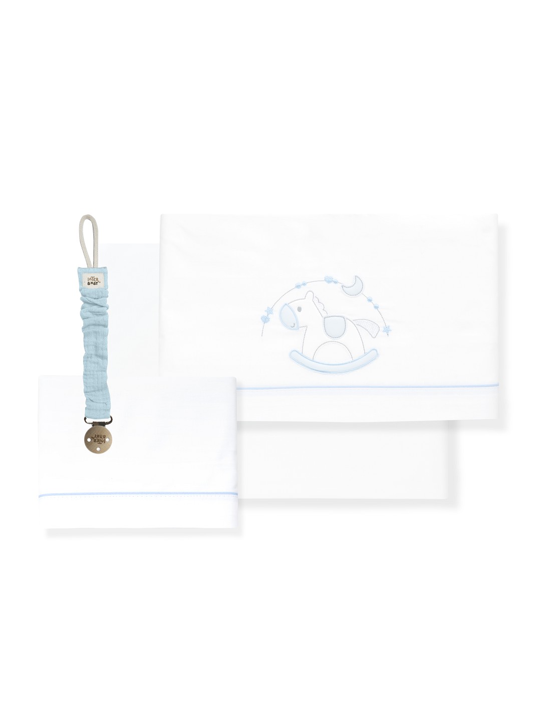 Compuesto por encimera (103 x 150 cm) , bajera (60 x 120 cm) y funda de almohada (60 x 30 cm). 100 % algodón. Lavar en frío.