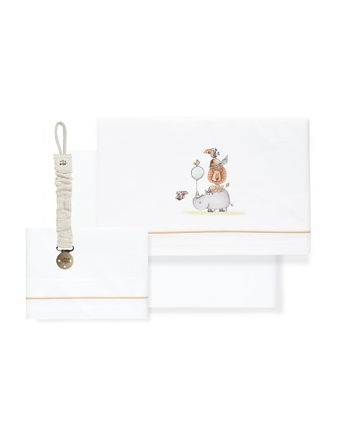Compuesto por encimera (103 x 150 cm) , bajera (60 x 120 cm) y funda de almohada (60 x 30 cm). 100 % algodón. Lavar en frío.