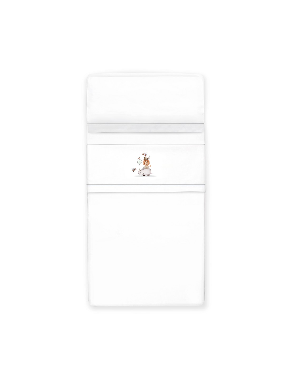 Compuesto por encimera (103 x 150 cm) , bajera (60 x 120 cm) y funda de almohada (60 x 30 cm). 100 % algodón. Lavar en frío.