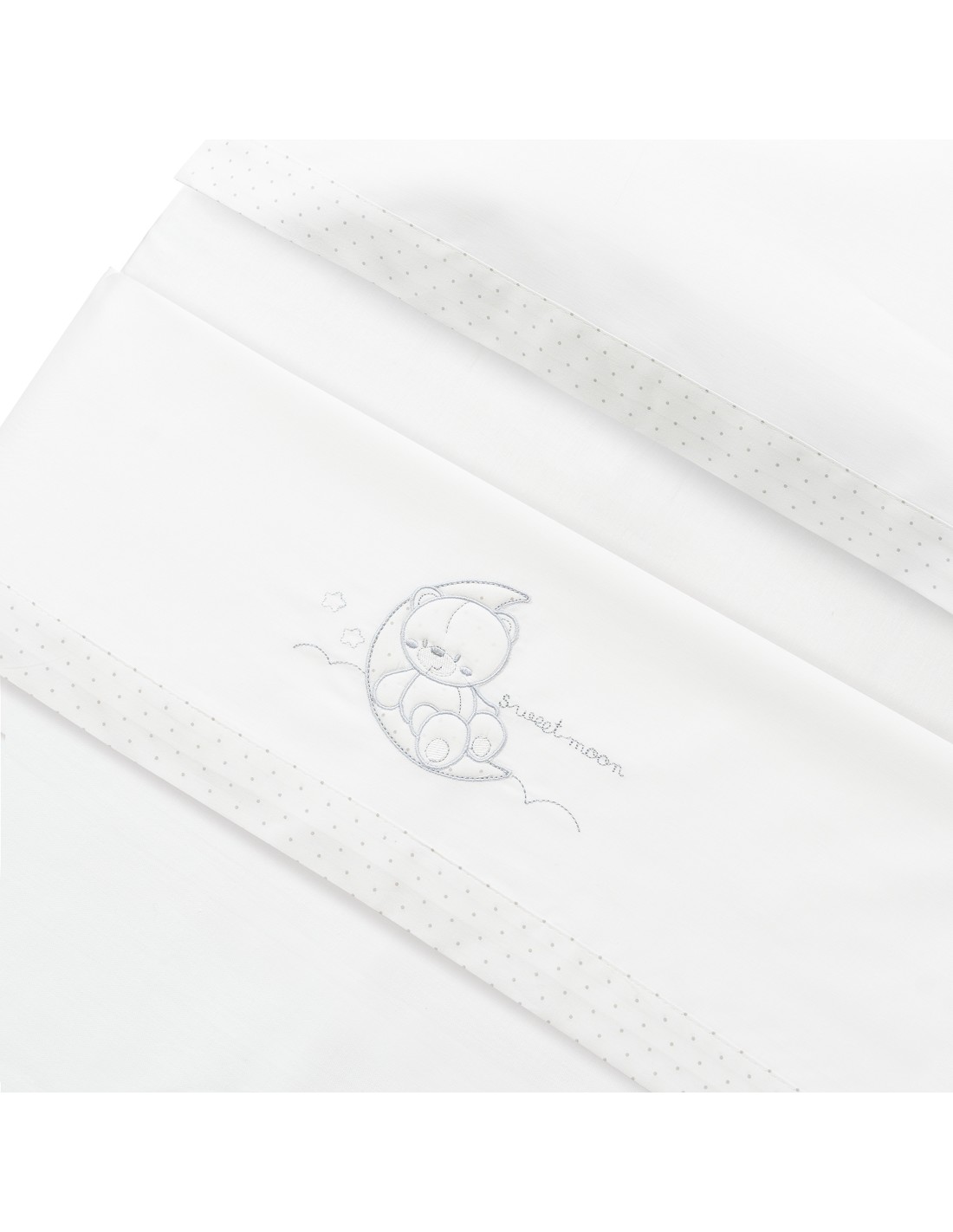 Compuesto por encimera (82 x 114 cm) , bajera (50 x 80 cm) y funda de almohada (50 x 30 cm). 100 % algodón. Lavar en frío.