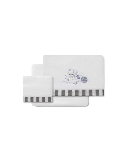 Compuesto por encimera (72 X 114cm) , bajera (40 X 80 cm) y funda de almohada (40 x 25 cm). 100 % poliester. Lavar en frío.