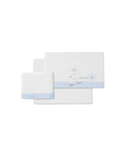 Compuesto por encimera (103 x 150 cm) , bajera (60 x 120 cm) y funda de almohada (60 x 30 cm). 100 % algodón. Lavar en frío.