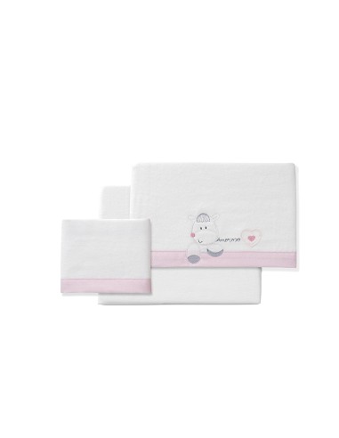 Compuesto por encimera (103 x 150 cm) , bajera (60 x 120 cm) y funda de almohada (60 x 30 cm). 100 % algodón. Lavar en frío.