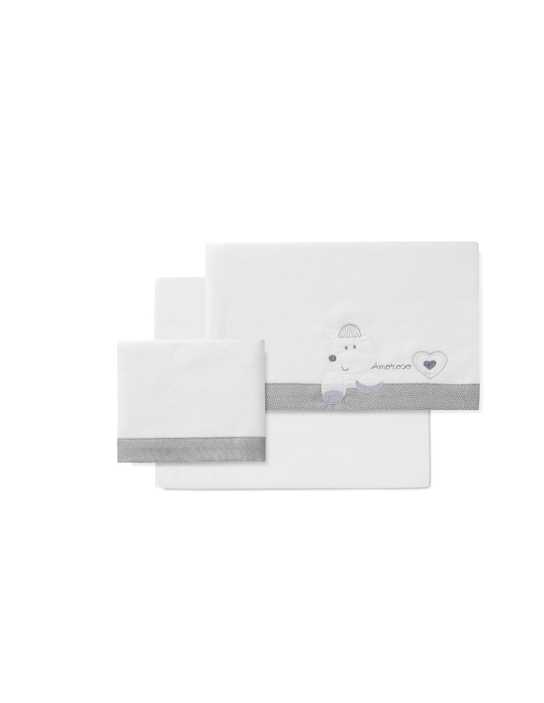 Compuesto por encimera (103 x 150 cm) , bajera (60 x 120 cm) y funda de almohada (60 x 30 cm). 100 % algodón. Lavar en frío.