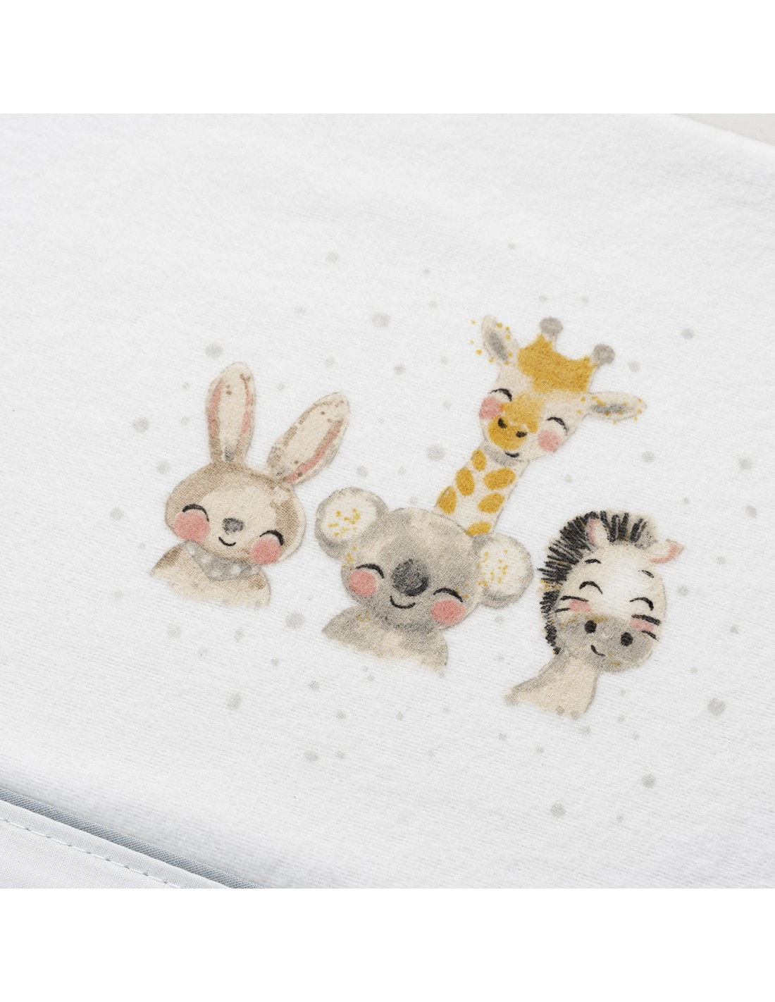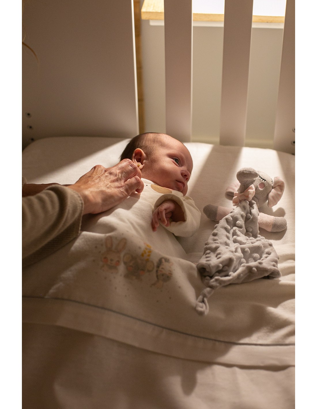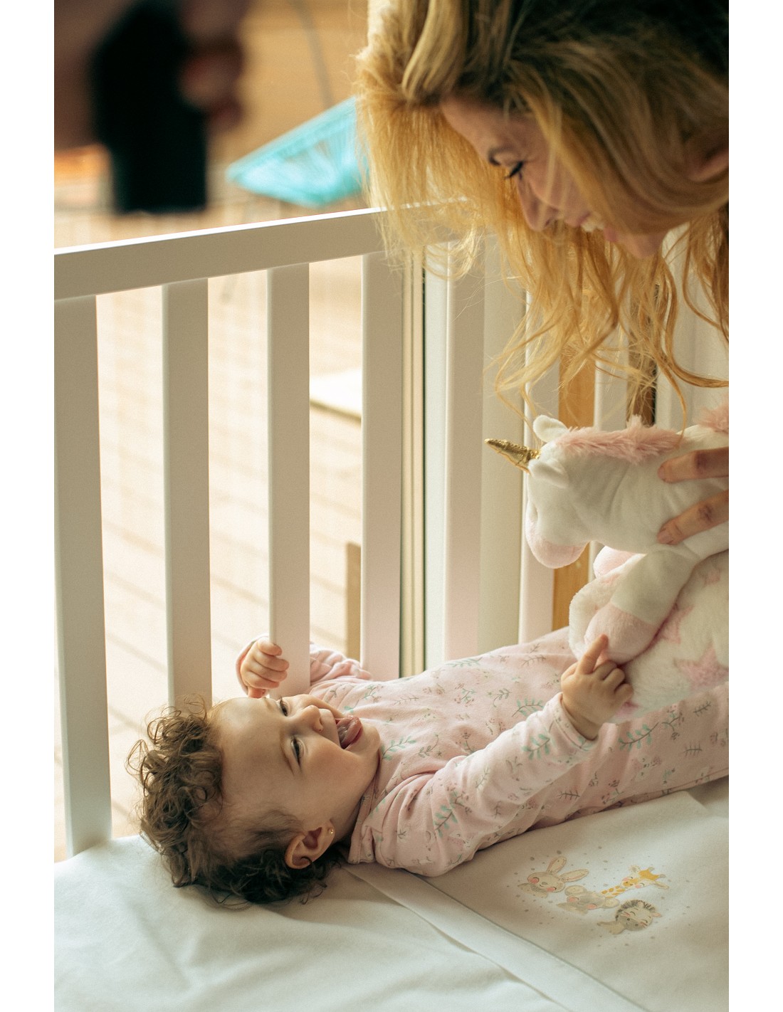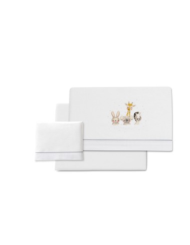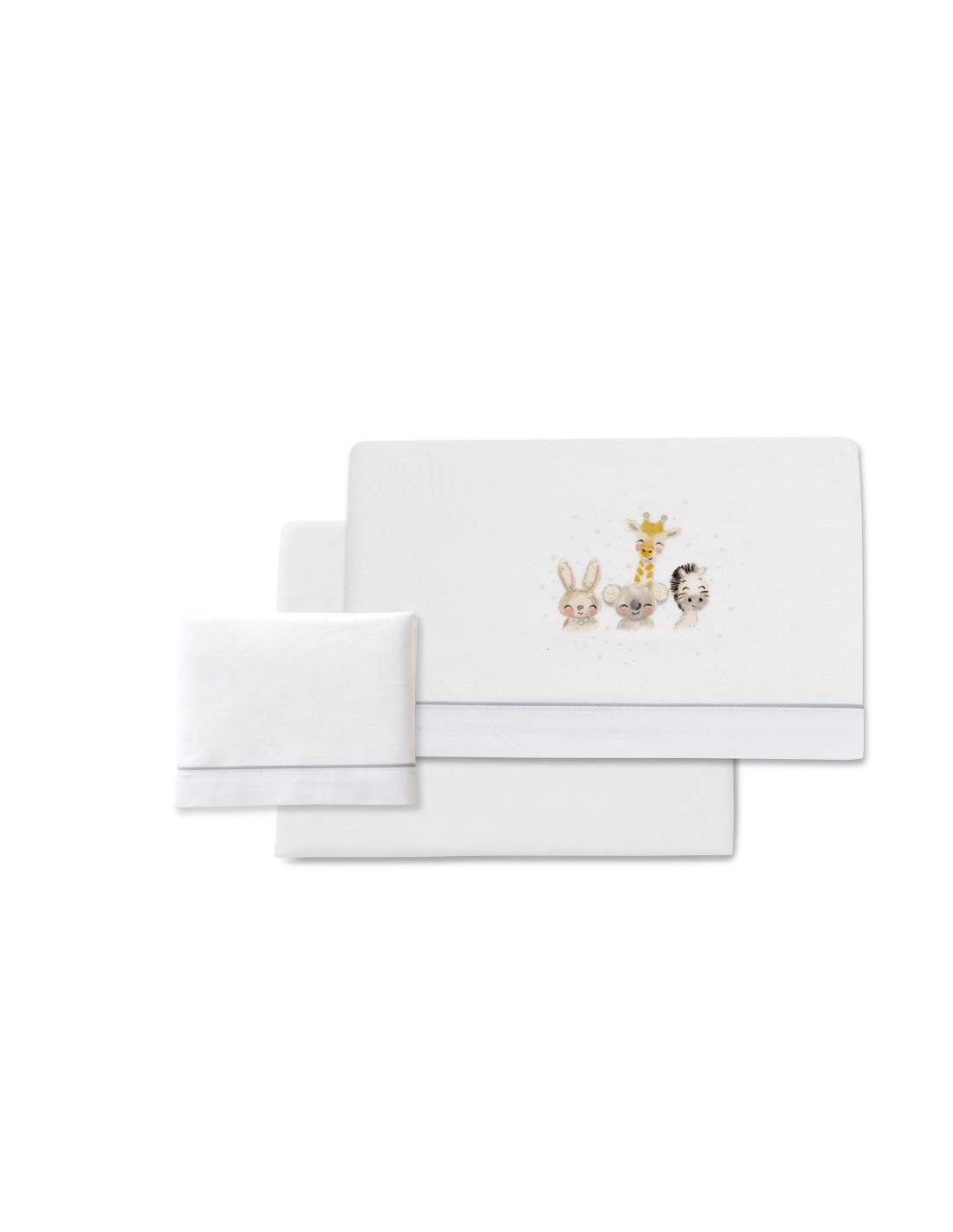 Compuesto por encimera (103 x 150 cm) , bajera (60 x 120 cm) y funda de almohada (60 x 30 cm). 100 % algodón. Lavar en frío.