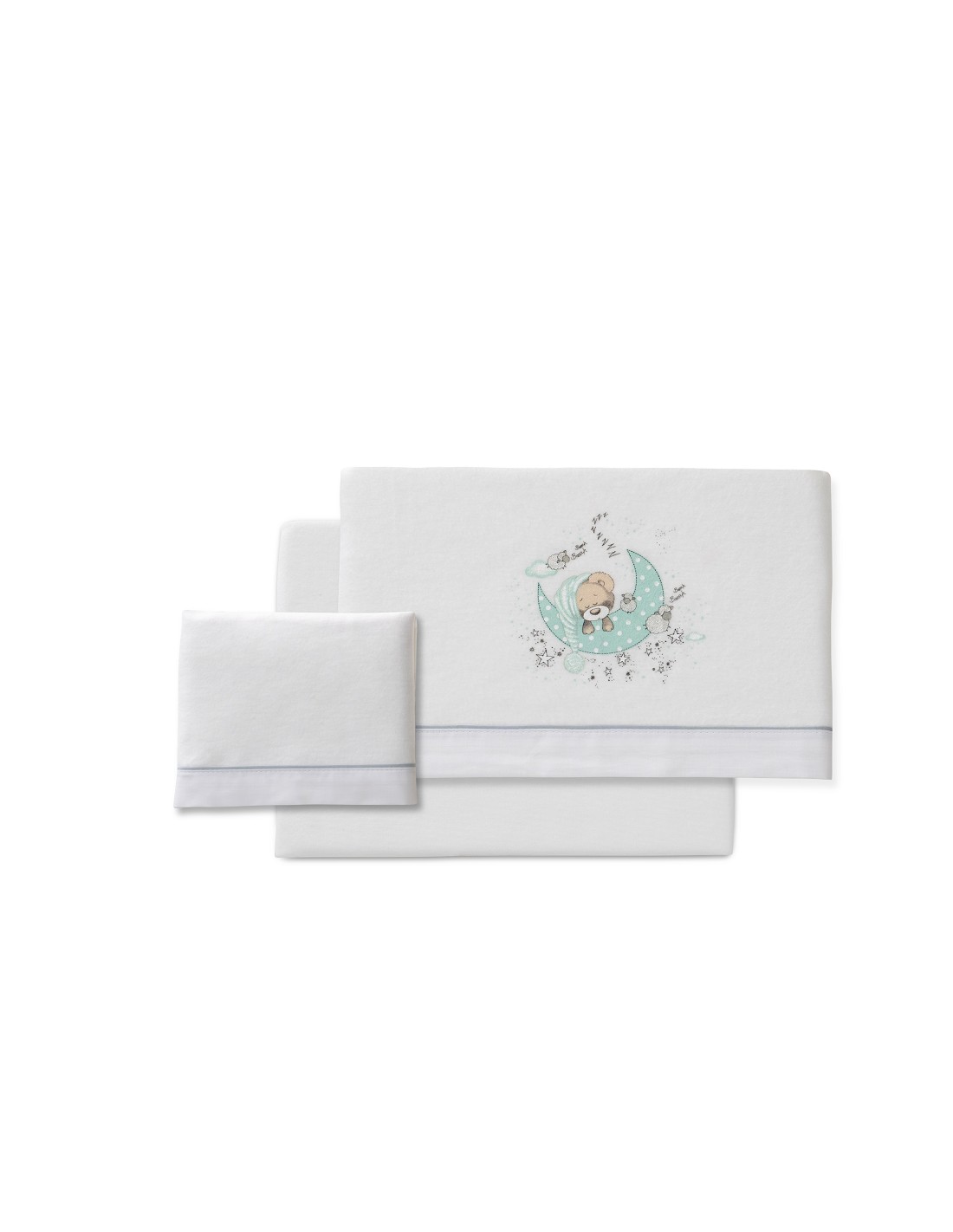 Compuesto por encimera (103 x 150 cm) , bajera (60 x 120 cm) y funda de almohada (60 x 30 cm). 100 % algodón. Lavar en frío.