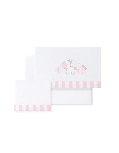 Compuesto por encimera (103 x 150 cm) , bajera (60 x 120 cm) y funda de almohada (60 x 30 cm). 100 % algodón. Lavar en frío.