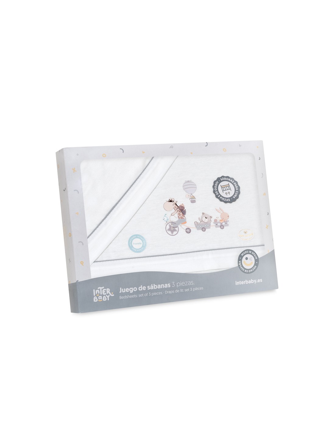 Compuesto por encimera (103 x 150 cm) , bajera (60 x 120 cm) y funda de almohada (60 x 30 cm). 100 % algodón. Lavar en frío.