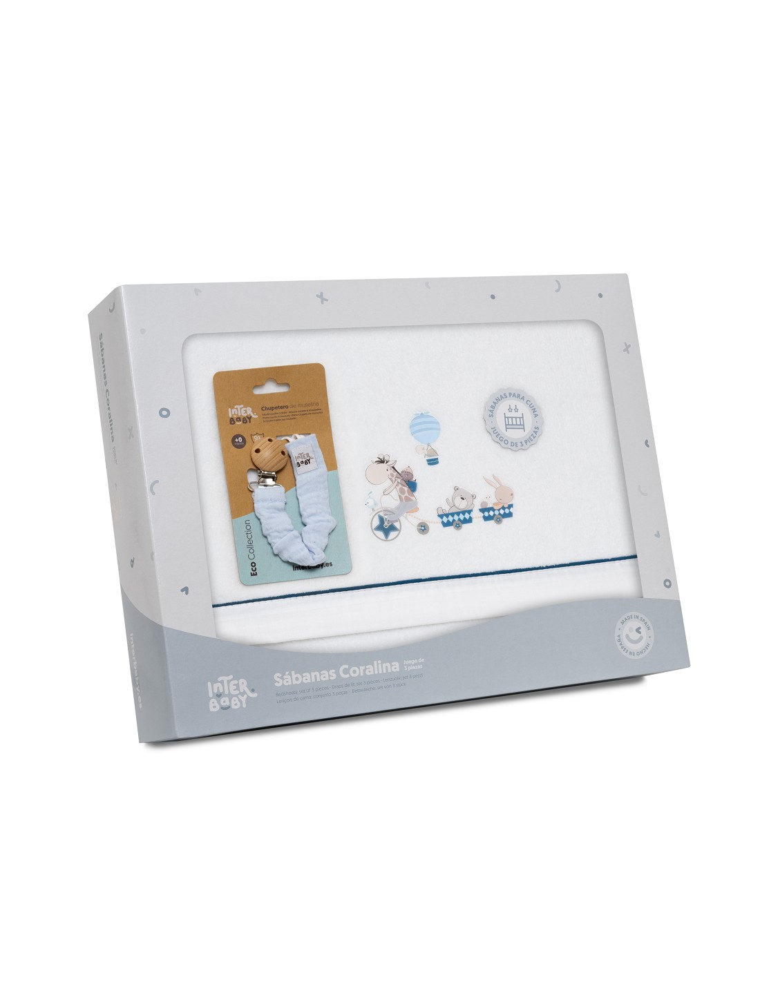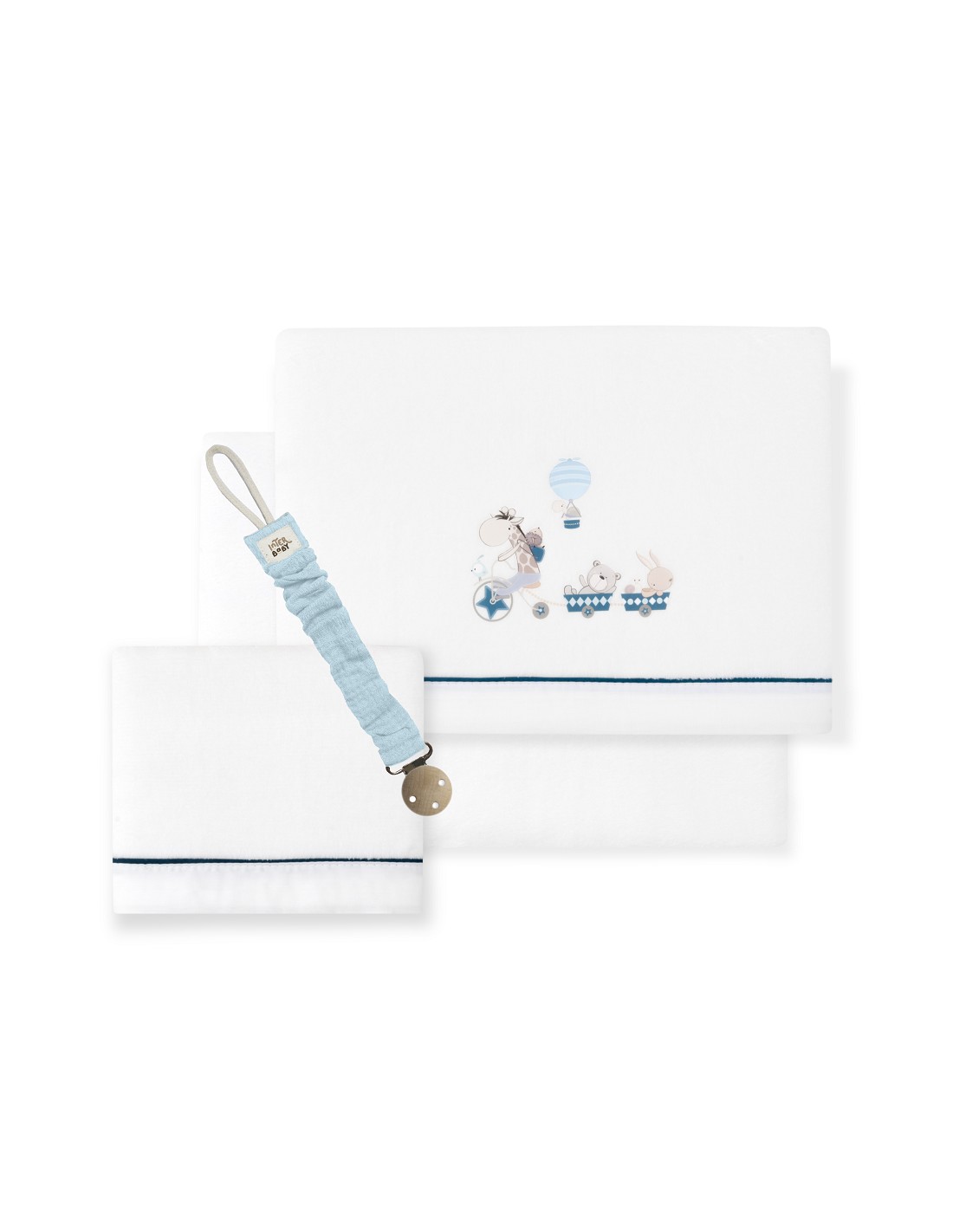 Compuesto por encimera (103 x 150 cm) , bajera (60 x 120 cm) y funda de almohada (60 x 30 cm). 100 % POLIESTER. Lavar en frío.
