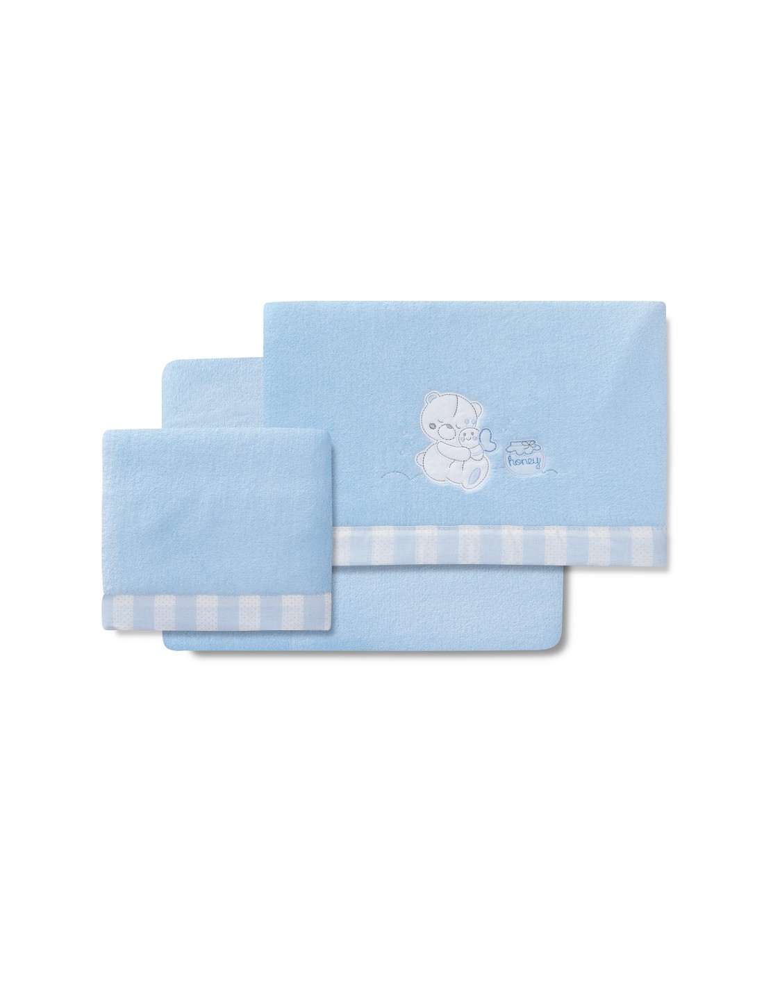 Compuesto por encimera (82 x 114 cm) , bajera (50 x 80 cm) y funda de almohada (50 x 30 cm). 100 % poliester. Lavar en frío.