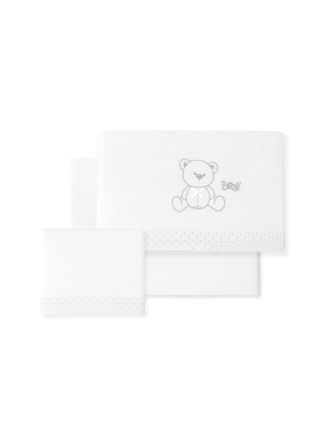 Compuesto por encimera (82 x 114 cm) , bajera (50 x 80 cm) y funda de almohada (50 x 30 cm). 100 % algodón. Lavar en frío.