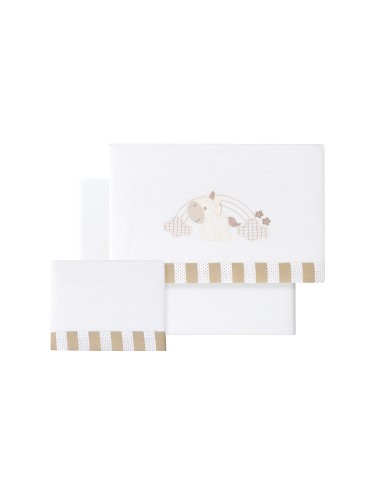 Compuesto por encimera (82 x 114 cm) , bajera (50 x 80 cm) y funda de almohada (50 x 30 cm). 100 % algodón. Lavar en frío.