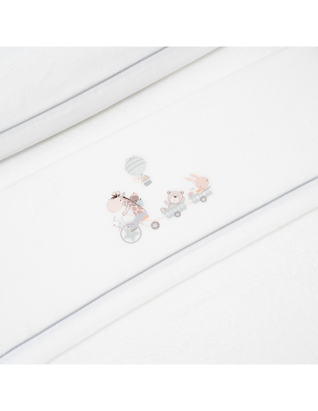 Compuesto por encimera (82 x 114 cm) , bajera (50 x 80 cm) y funda de almohada (50 x 30 cm). 100 % poliester. Lavar en frío.