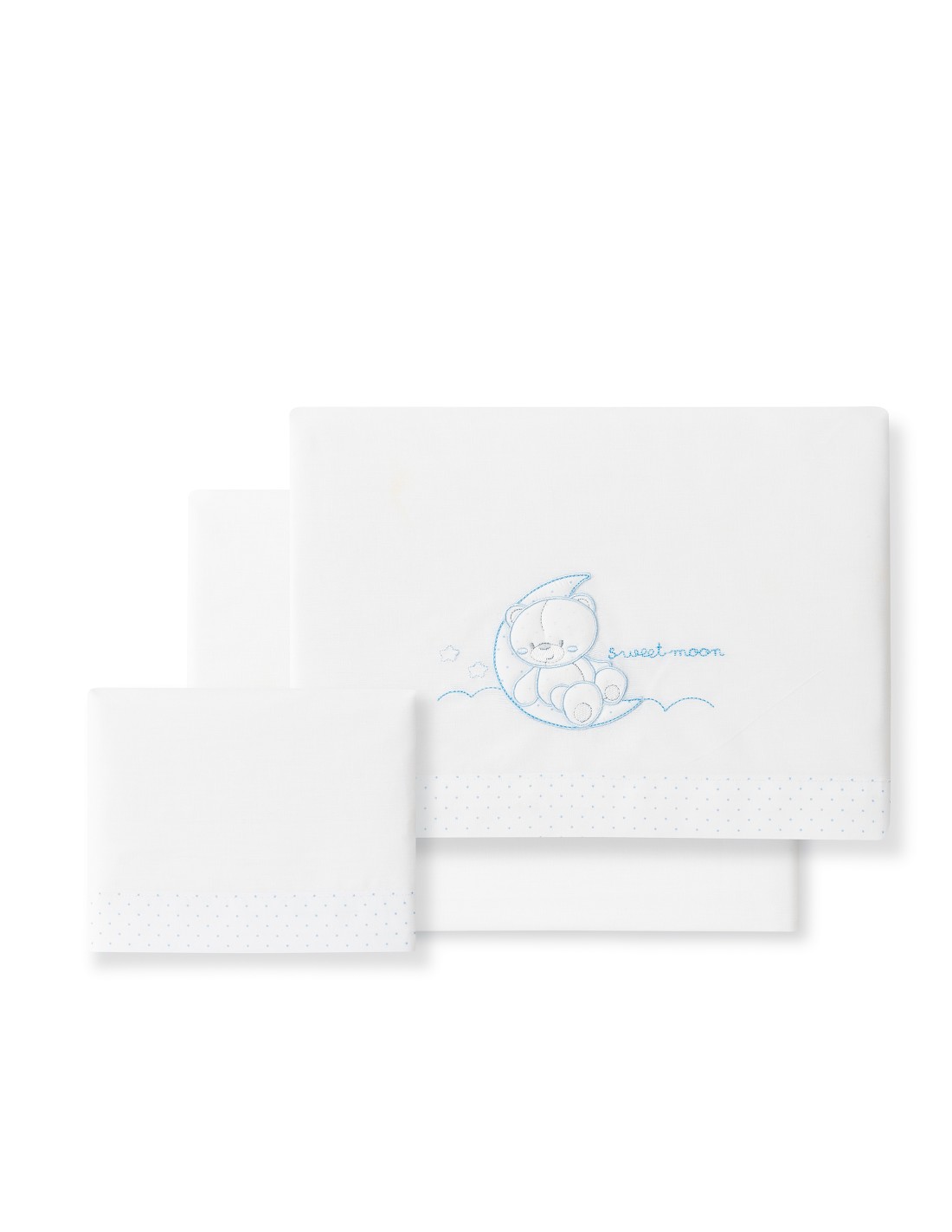 Compuesto por encimera (72 X 114cm) , bajera (40 X 80 cm) y funda de almohada (40 x 25 cm). 100 % algodón. Lavar en frío.
