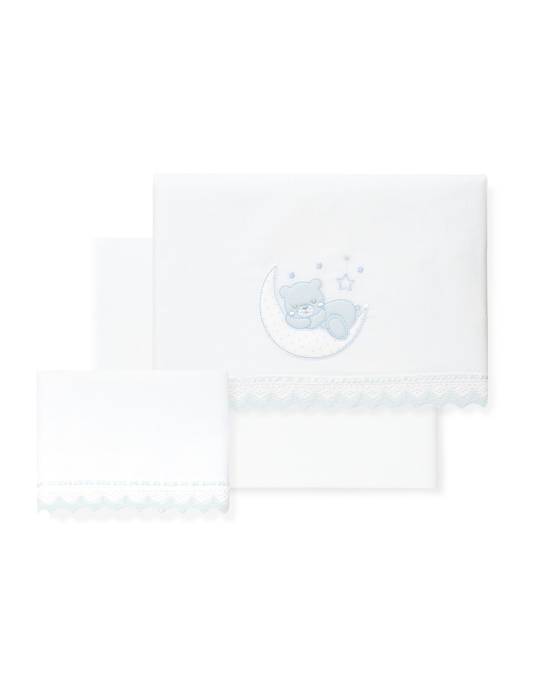 Compuesto por encimera (72 X 114cm) , bajera (40 X 80 cm) y funda de almohada (40 x 25 cm). 100 % algodón. Lavar en frío.