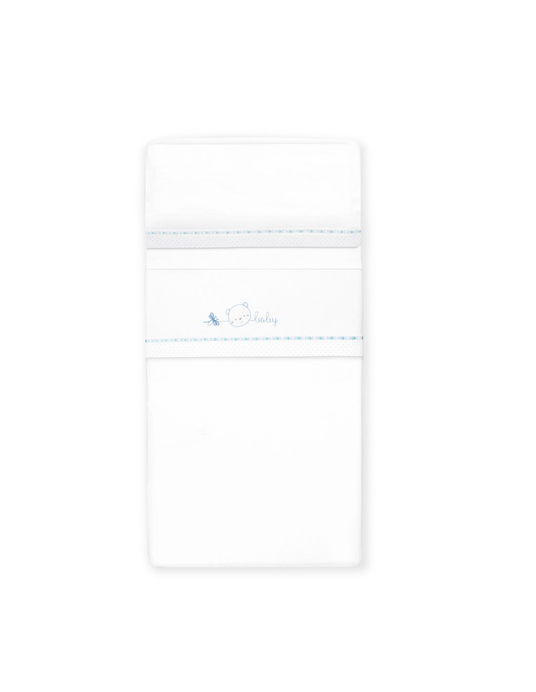 Compuesto por encimera (72 X 114cm) , bajera (40 X 80 cm) y funda de almohada (40 x 25 cm). 100 % algodón. Lavar en frío.