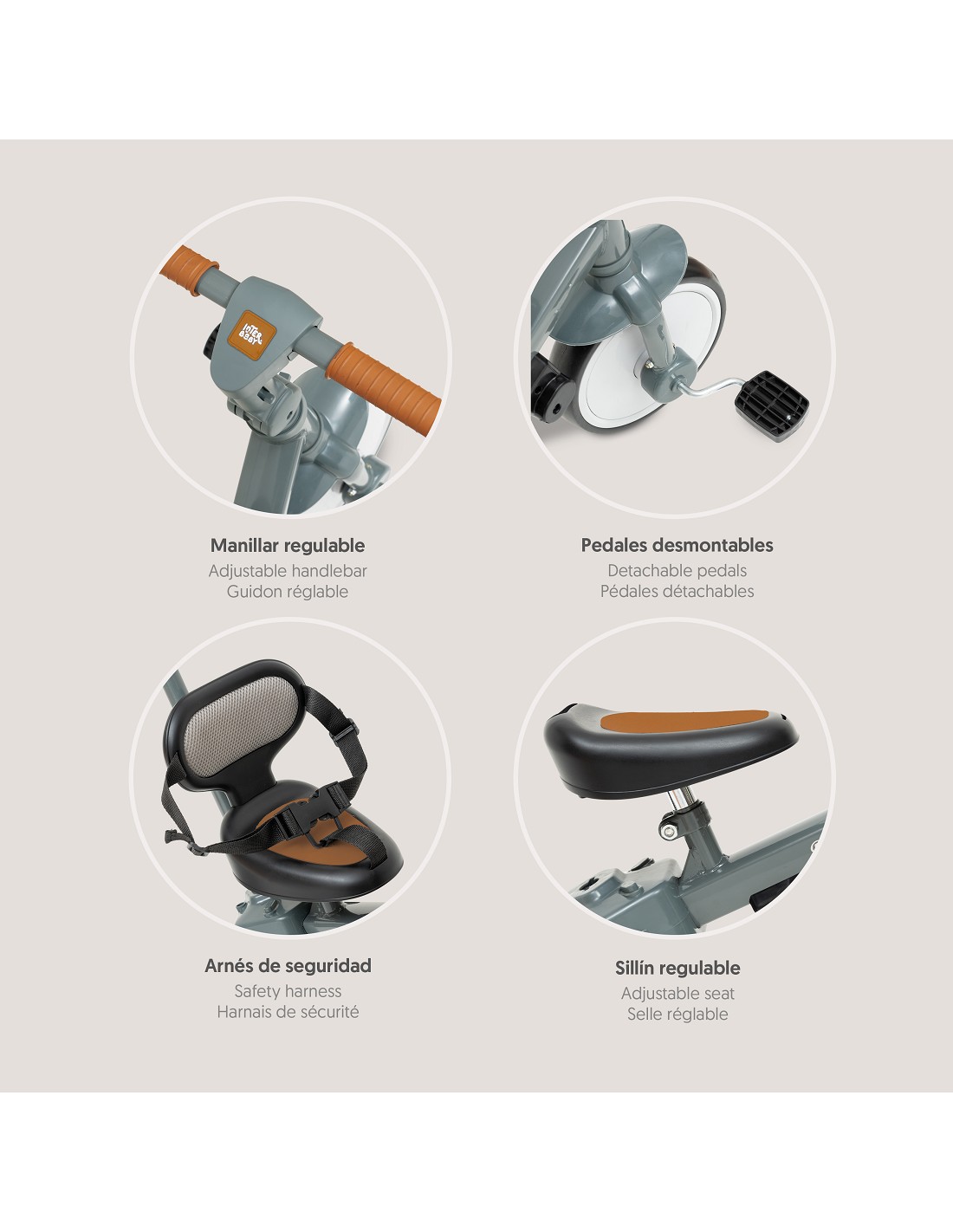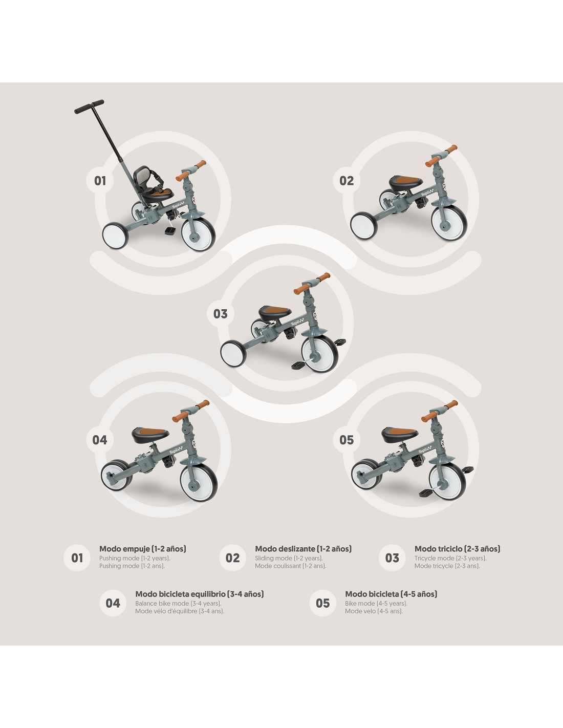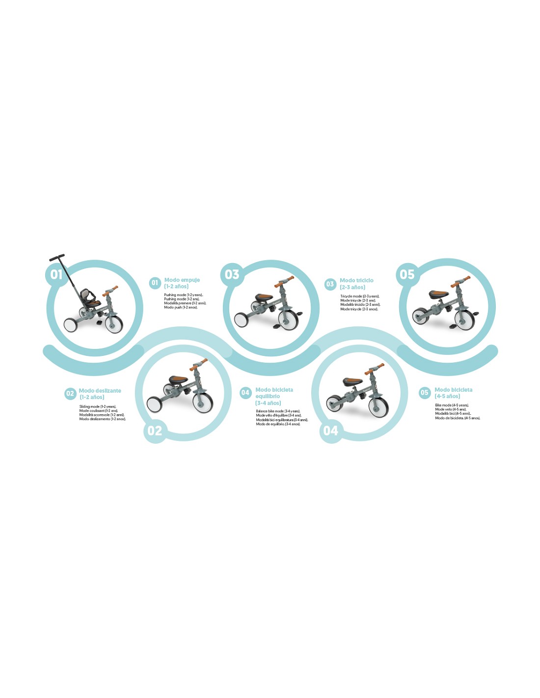 Triciclo multifuncional 5 en 1. Modo empuje 1 a 2 años. Modo deslizante 1 a 2 años. Modo triciclo 2 a 3 años. Modo bicicleta equilibrio 3 a 4 años . Modo bicicleta de 4 a 5 años. Manillar regulable. Arnes de seguridad. Sillín regulable. Pedales desmontables.