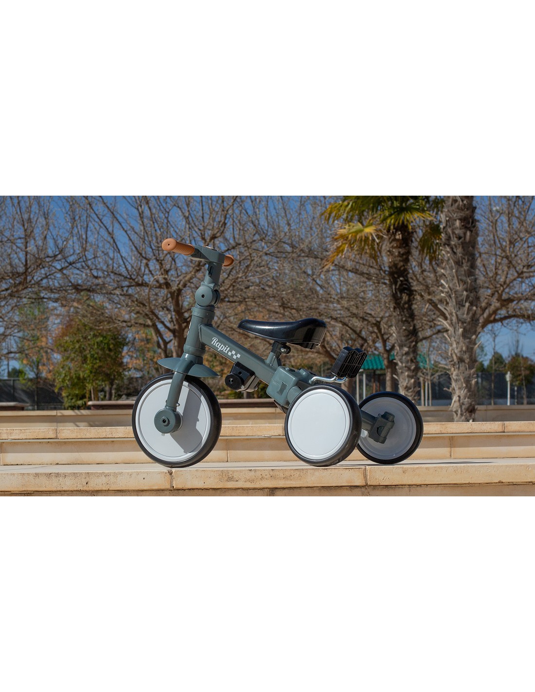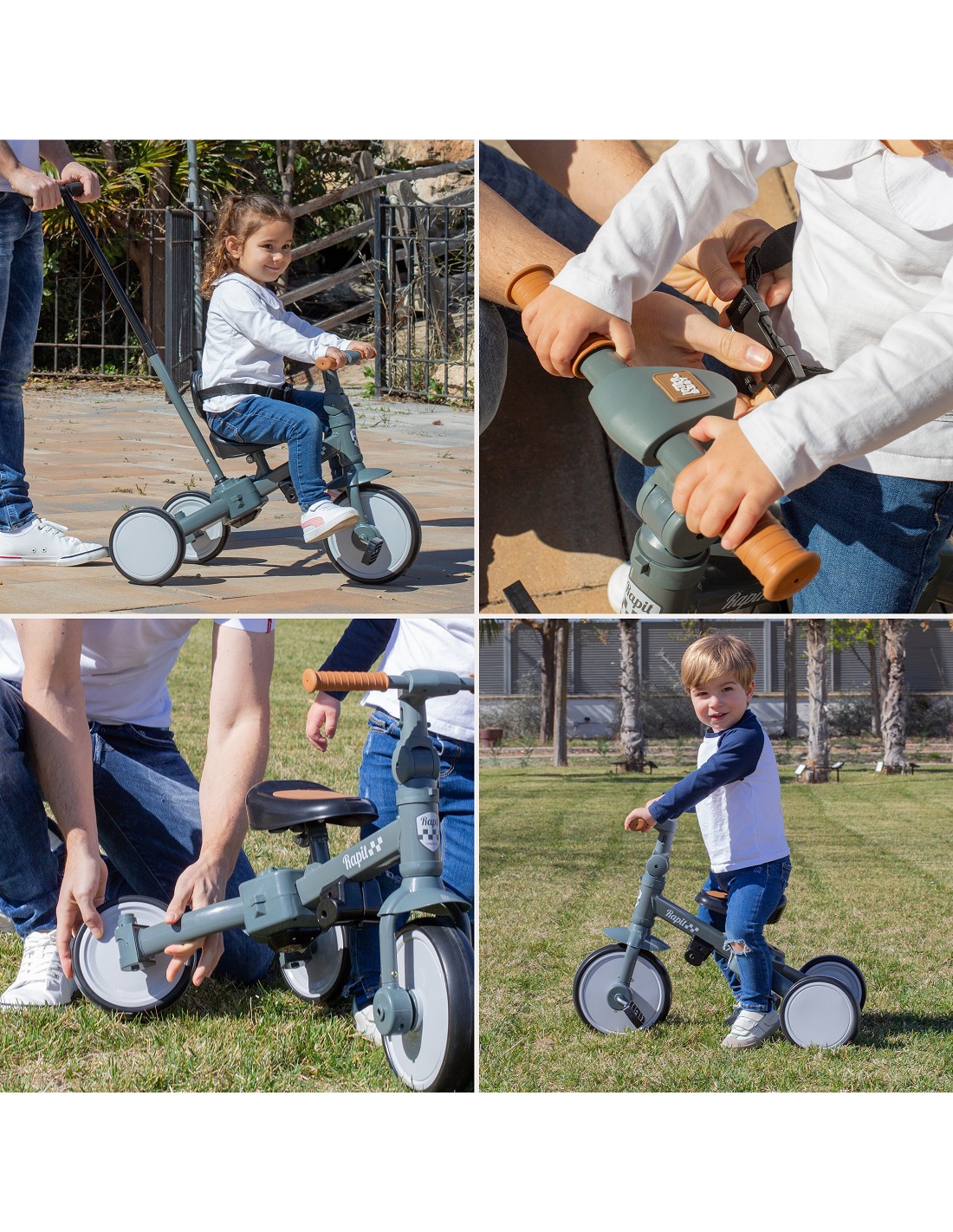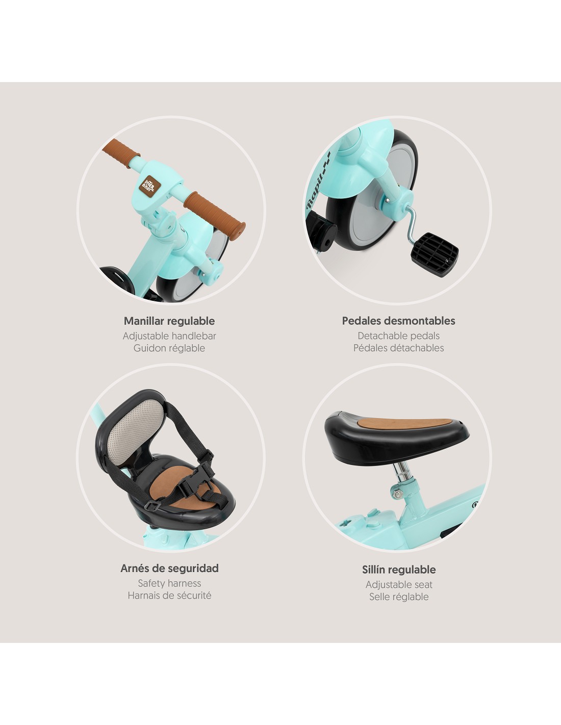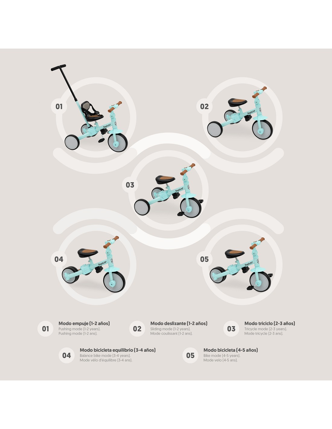Triciclo multifuncional 5 en 1. Modo empuje 1 a 2 años. Modo deslizante 1 a 2 años. Modo triciclo 2 a 3 años. Modo bicicleta equilibrio 3 a 4 años . Modo bicicleta de 4 a 5 años. Manillar regulable. Arnes de seguridad. Sillín regulable. Pedales desmontables.