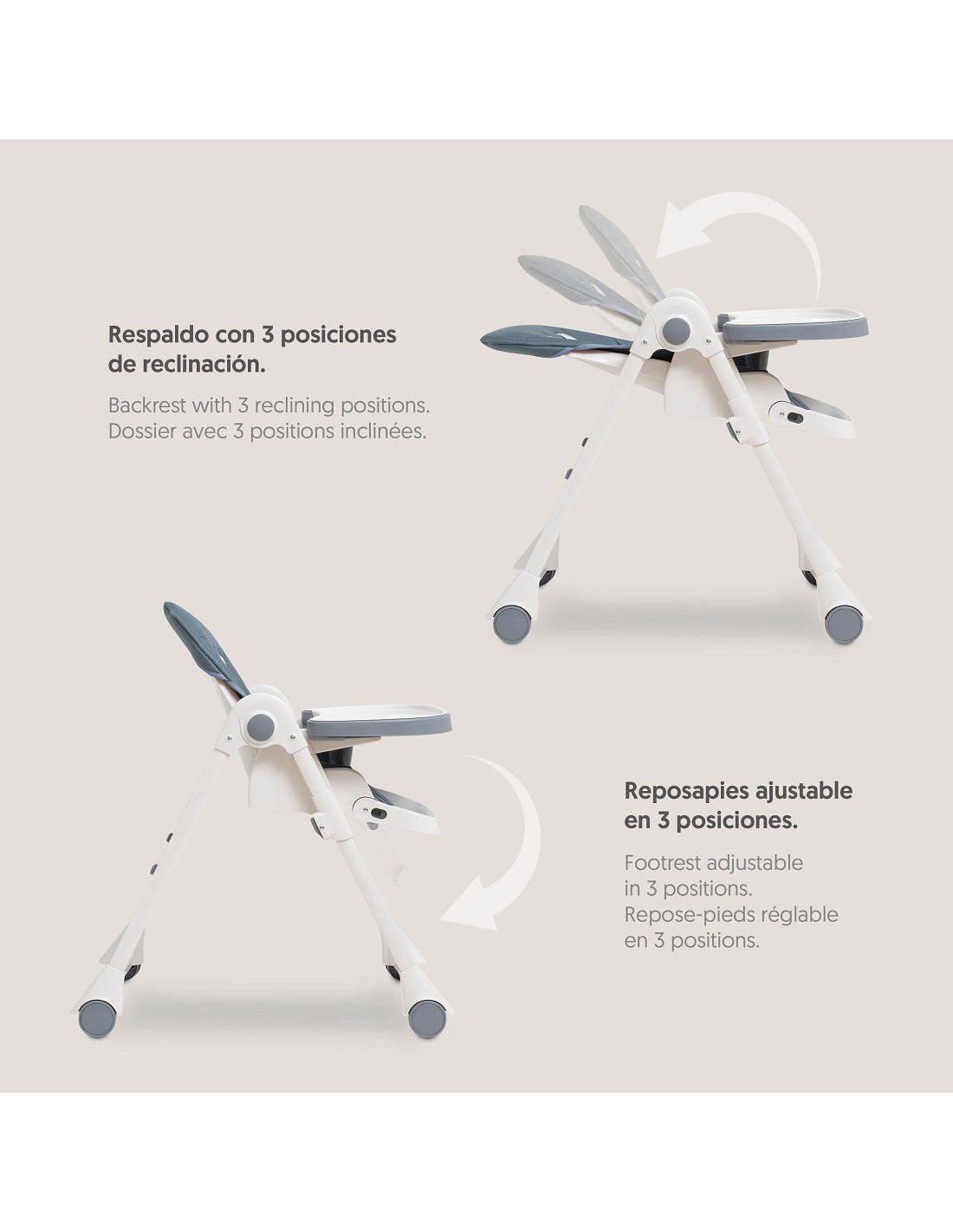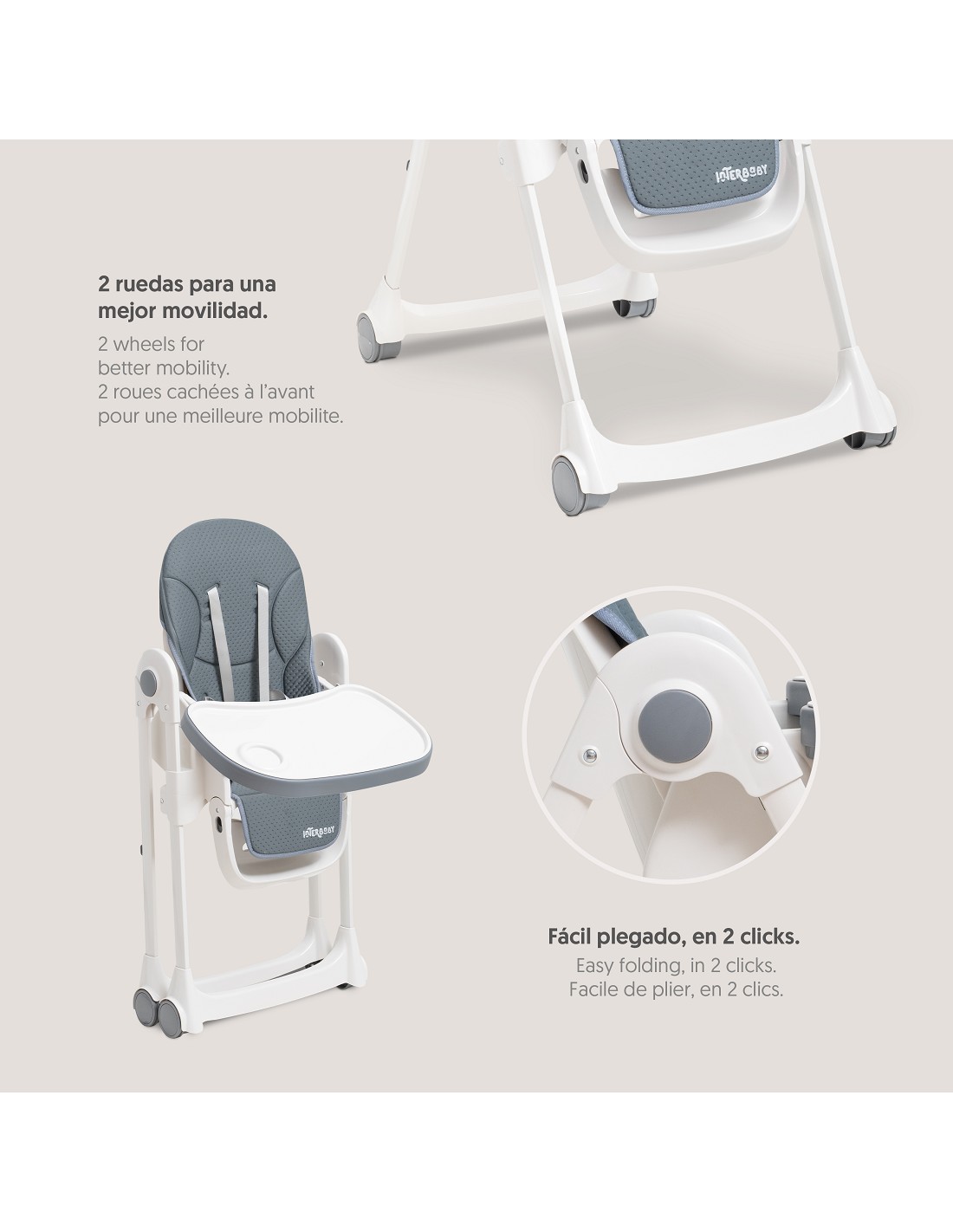 Trona Bebe Plegable. Respaldo con 3 posiciones de reclinación. Regulable en 5 alturas. Fácil plegado en 2 clicks. Bandeja regulable en 3 posiciones. Reposapies ajustables en 3 posiciones. % puntos de anclaje para la total seguridad del bebé. 2 ruedas para mejor movilidad. Tejido acolchado y de fácil limpieza.