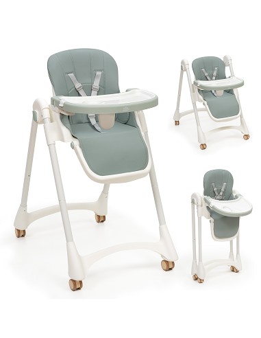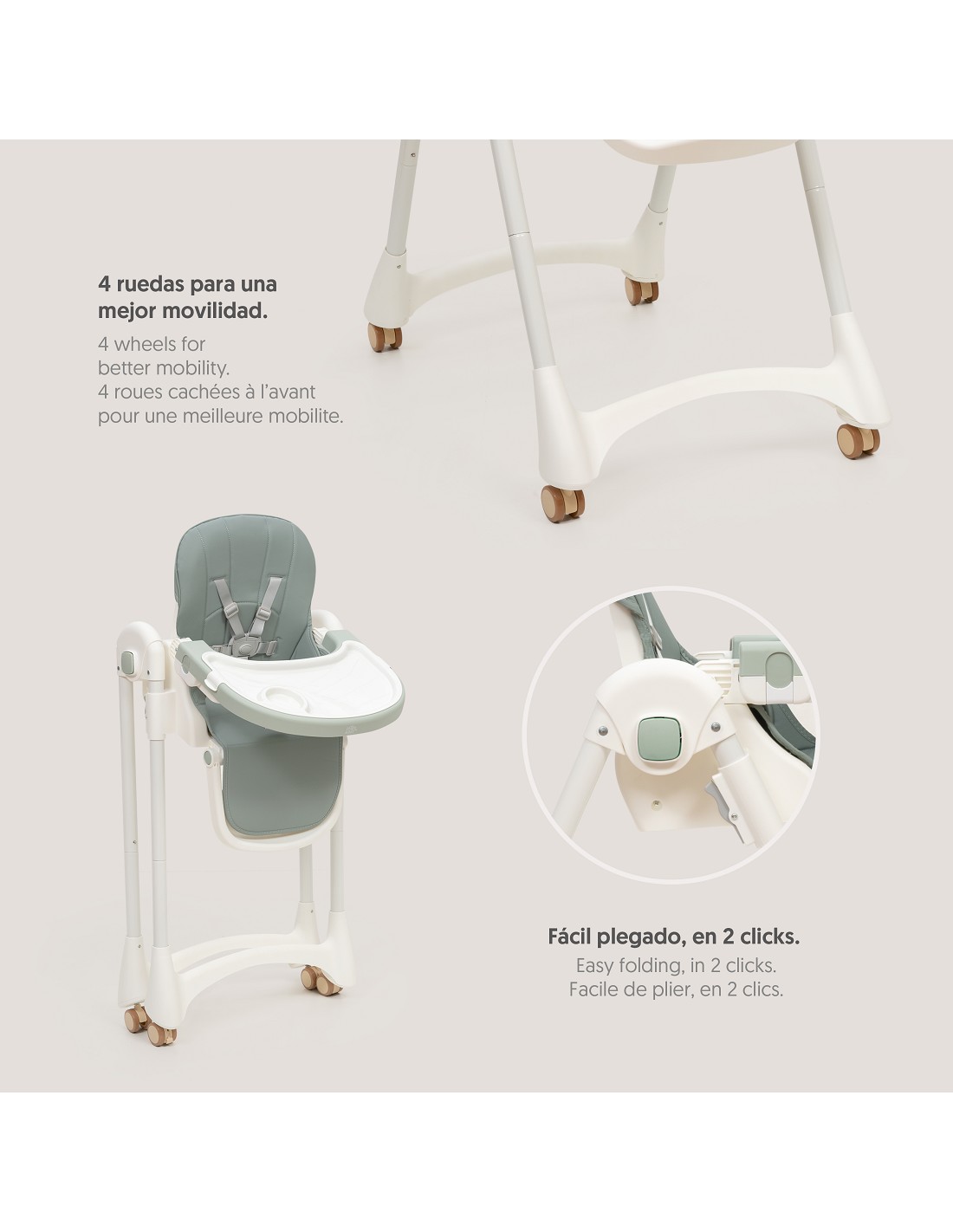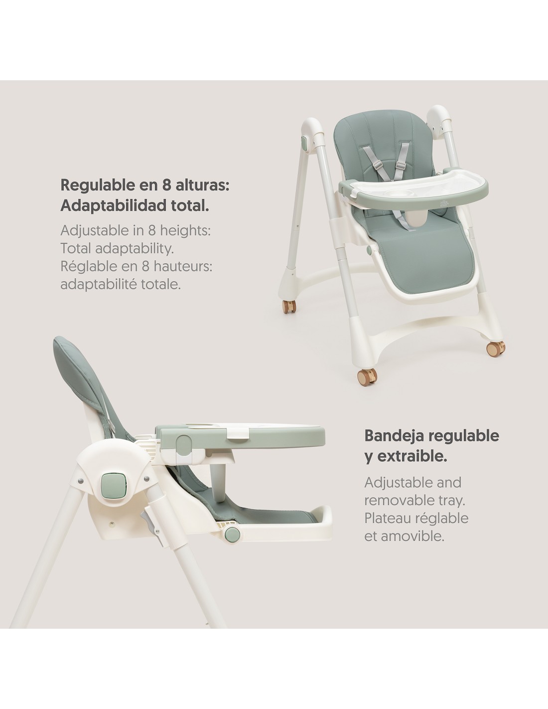 cómoda. Respaldo con 4 posiciones de reclinación. Permite usar la trona de hamaca. Regulable en 8 alturas. Fácil plegado. Bandeja regulable. Tapa extraible de fácil limpieza. Apta para lavavajillas. ¡Seguridad! 5 puntos de anclaje. Incluye un arnés de seguridad de 5 puntos y un cinturón ajustable con cintas regulables para garantizar la máxima seguridad en cada uso. Reposapies ajustable. ¡Funcional! 4 ruedas para una mejor movilidad. Compuesta con un tejido acolchado y de fácil limpieza.