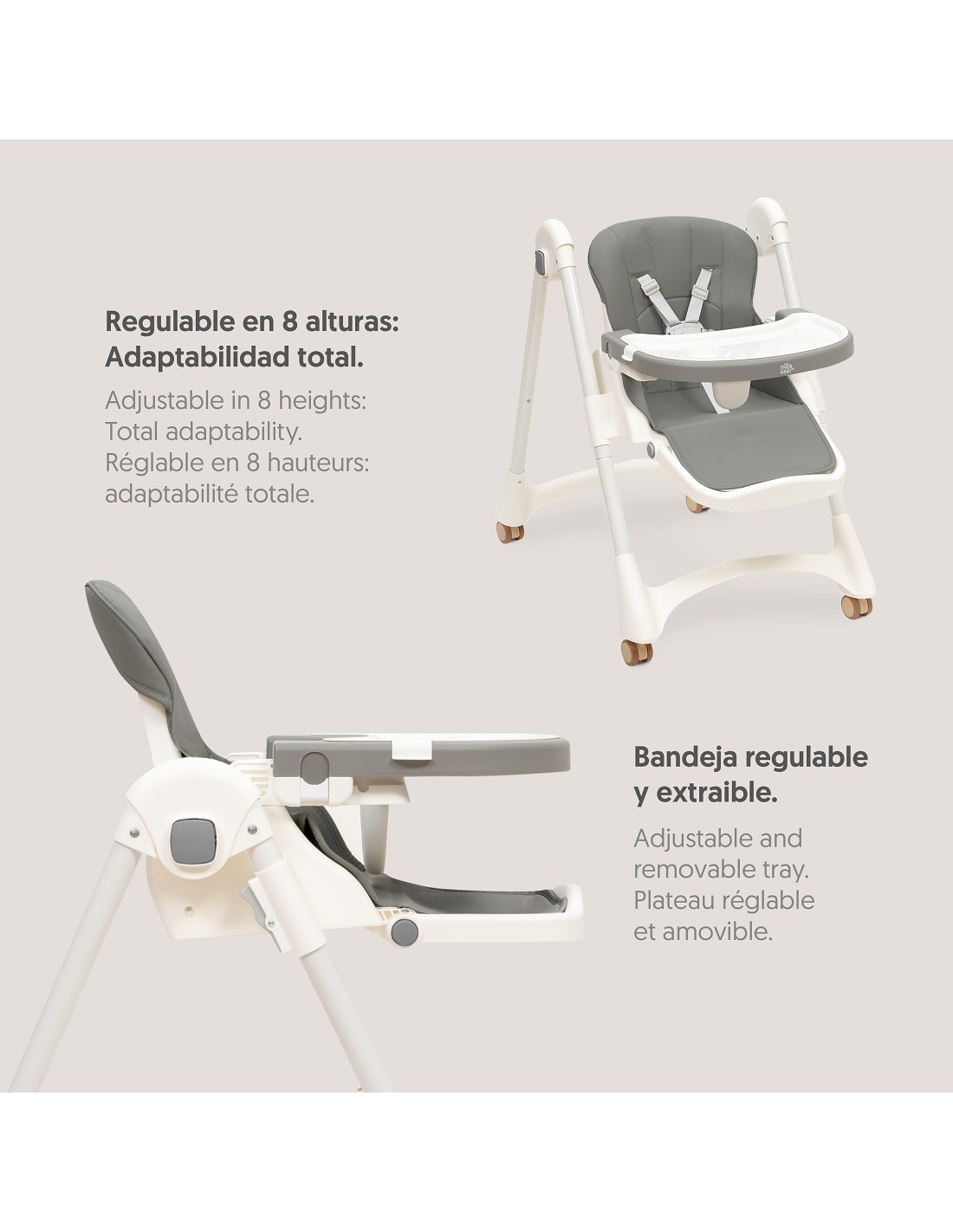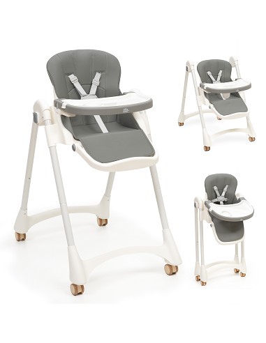 cómoda. Respaldo con 4 posiciones de reclinación. Permite usar la trona de hamaca. Regulable en 8 alturas. Fácil plegado. Bandeja regulable. Tapa extraible de fácil limpieza. Apta para lavavajillas. ¡Seguridad! 5 puntos de anclaje. Incluye un arnés de seguridad de 5 puntos y un cinturón ajustable con cintas regulables para garantizar la máxima seguridad en cada uso. Reposapies ajustable. ¡Funcional! 4 ruedas para una mejor movilidad. Compuesta con un tejido acolchado y de fácil limpieza.