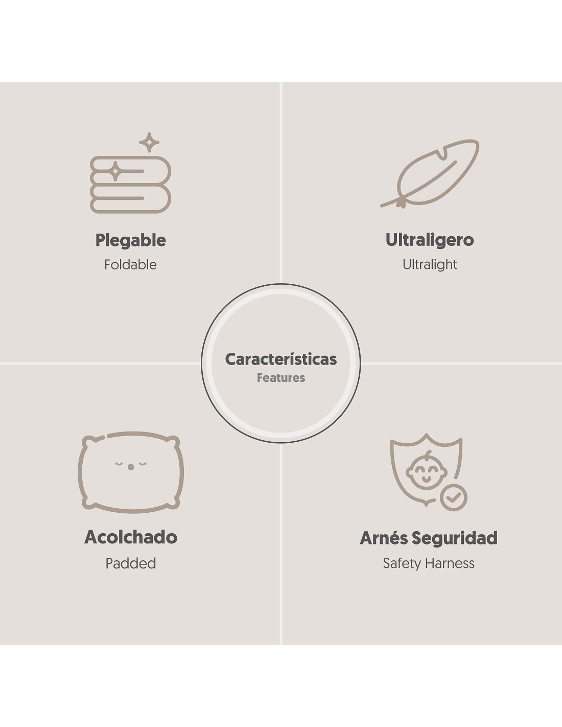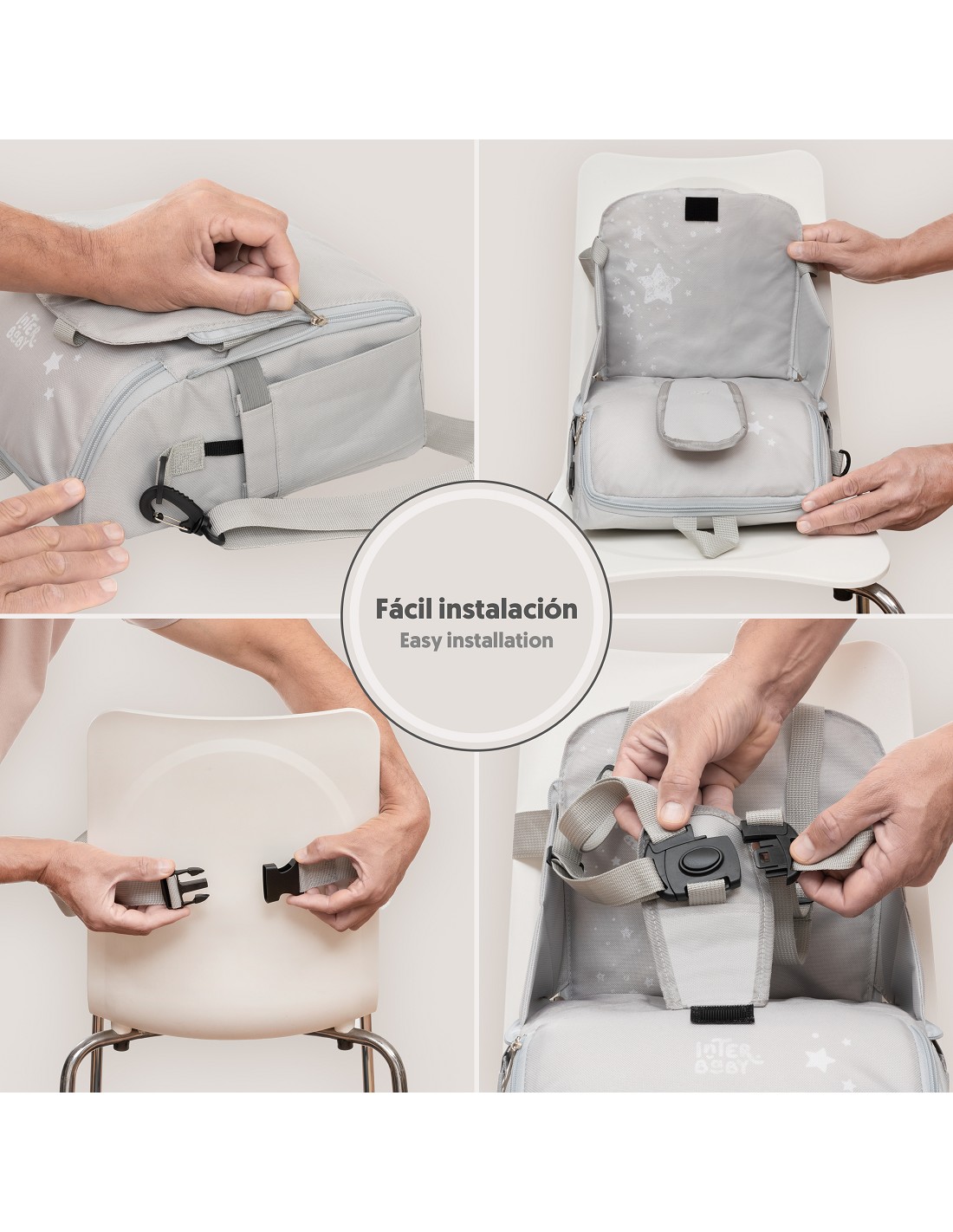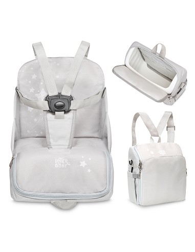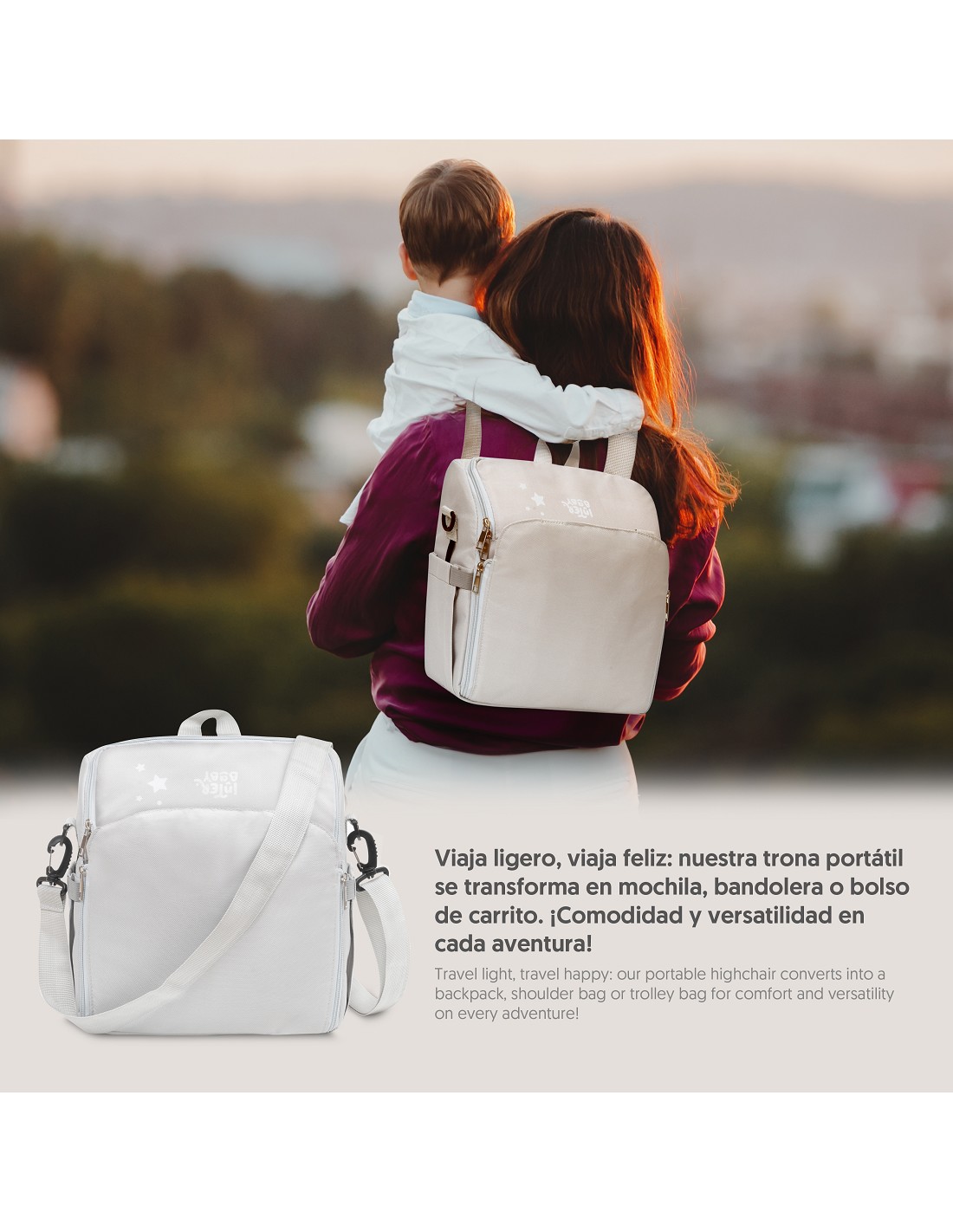 Trona de Viaje. Covertible en mochila o bolso. Plegable , ligera y con asa reguladora para transportarla. Arnés de seguridad de 5 puntos ajustables. Correas ajustables para acoplar a la silla. Compartimento de gran capacidad. Bolsillos interiores y laterales. Totalmente desenfundable. Recomendado de 6 a 36 meses o un máximo de 15 kg de peso.