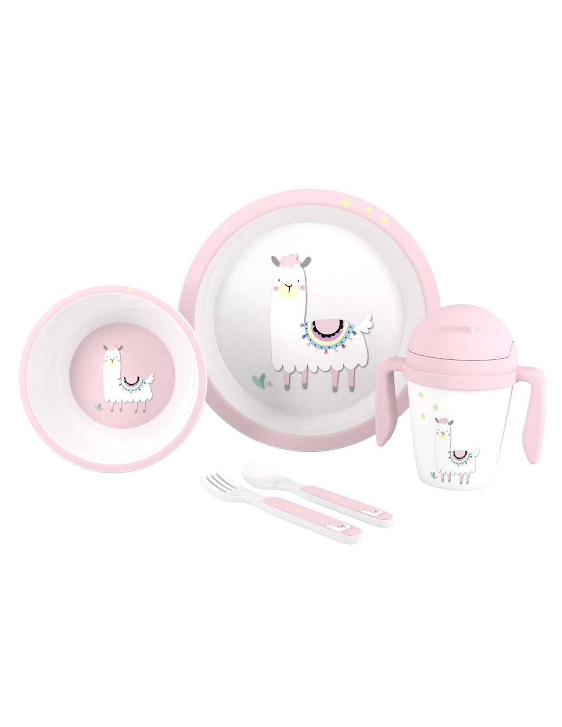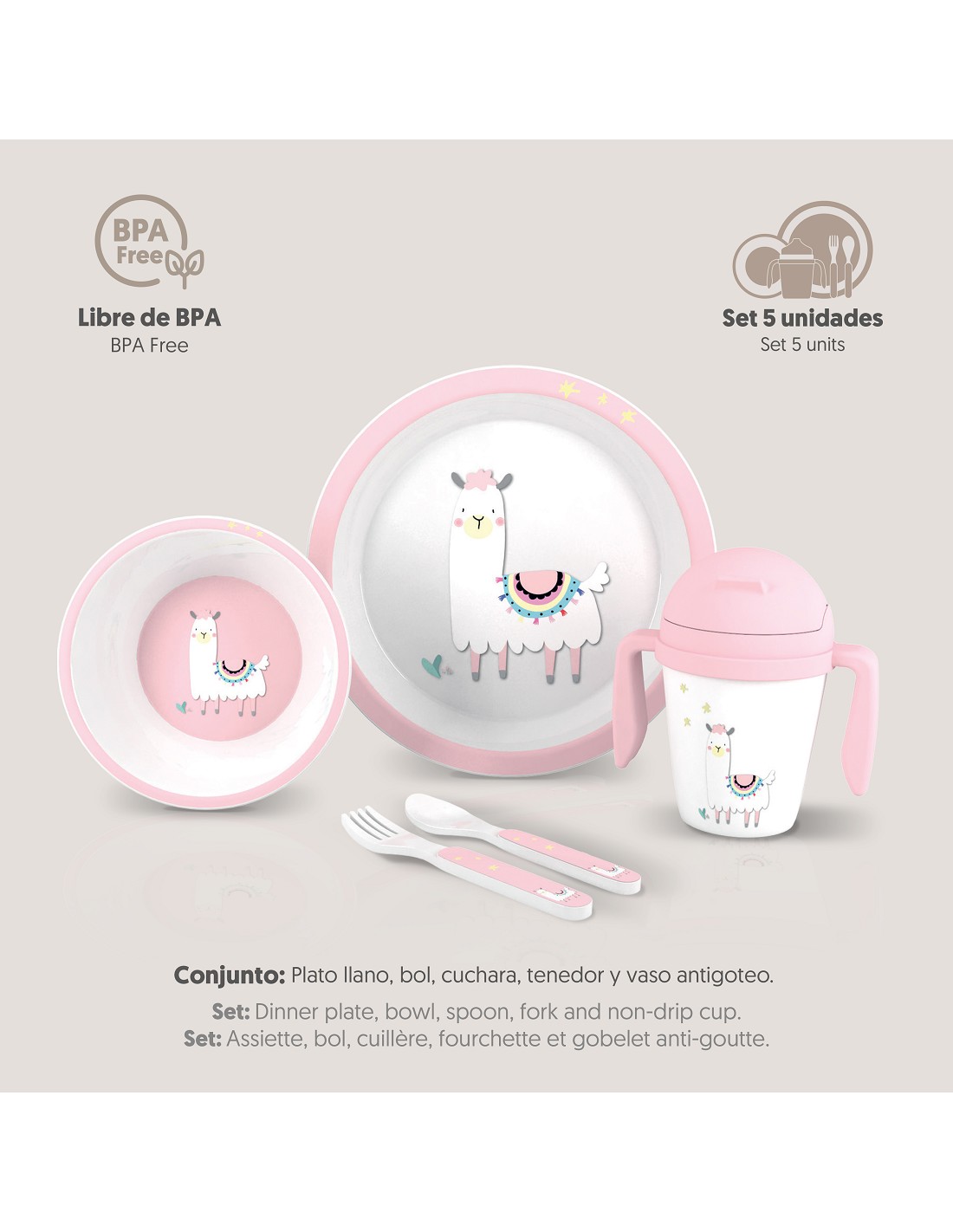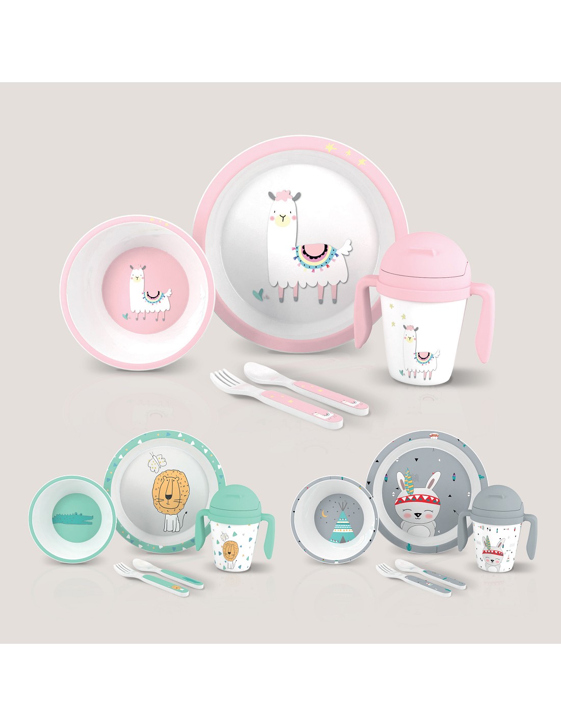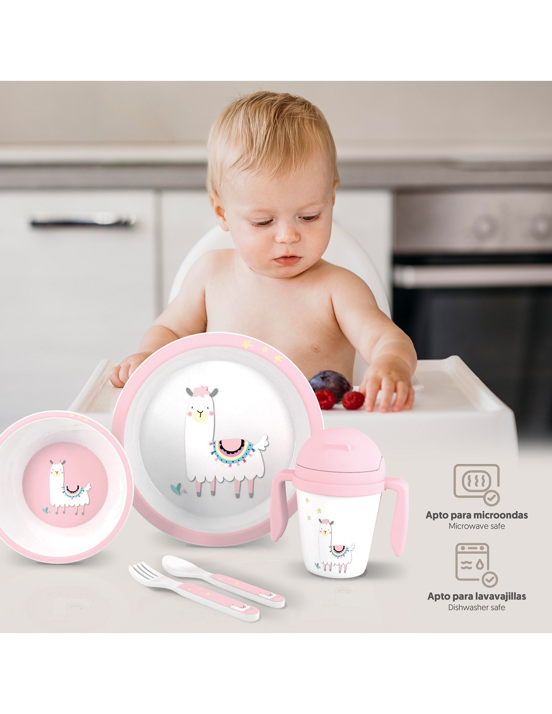 Vajiila de aprendizaje apata para microondas y lavavajillas. Pilipropileno libre de Bisfenol . Apta para temperaturas desde los -20ºC a los 120ºC. Contiene Plato llano, bo, cuchara, tenedor y vaso antigoteo de aprendizaje. Apto para mayores de 6 meses de edad.
