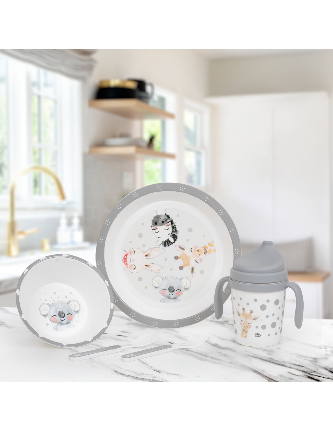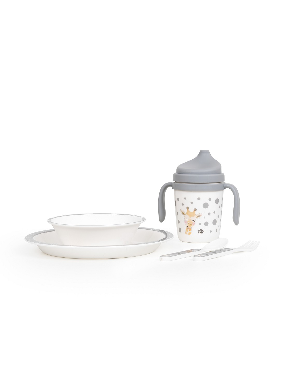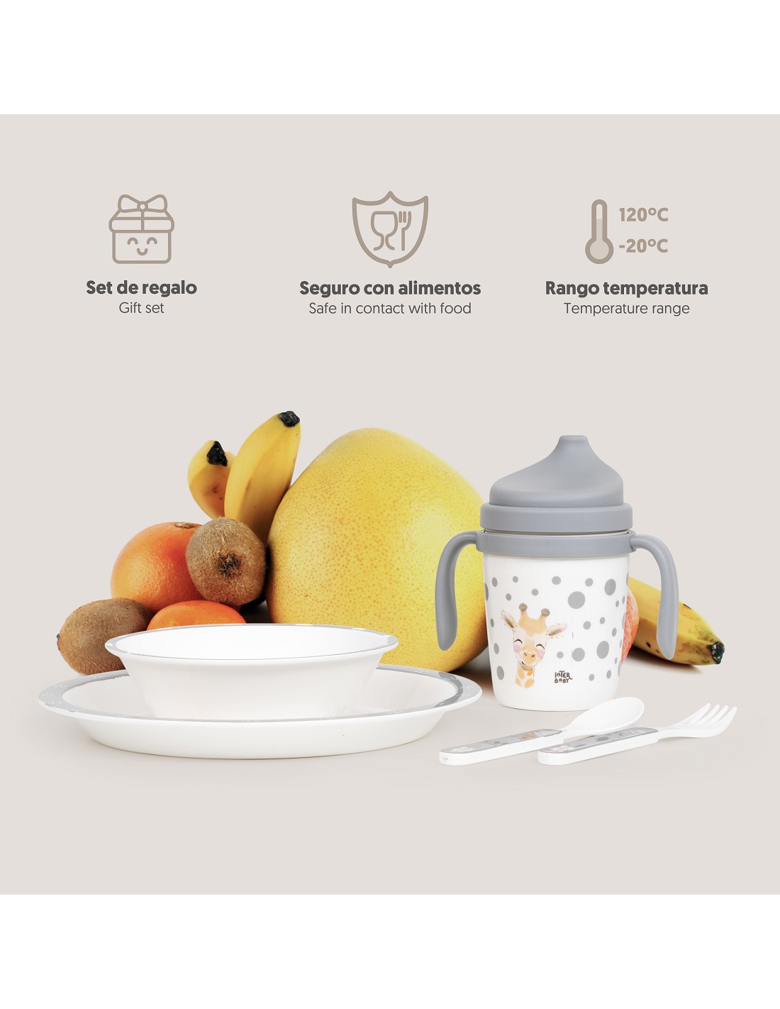 Vajiila de aprendizaje apata para microondas y lavavajillas. Pilipropileno libre de Bisfenol . Apta para temperaturas desde los -20ºC a los 120ºC. Contiene Plato llano, bol, cuchara, tenedor y vaso antigoteo de aprendizaje. Apto para mayores de 6 meses de edad.