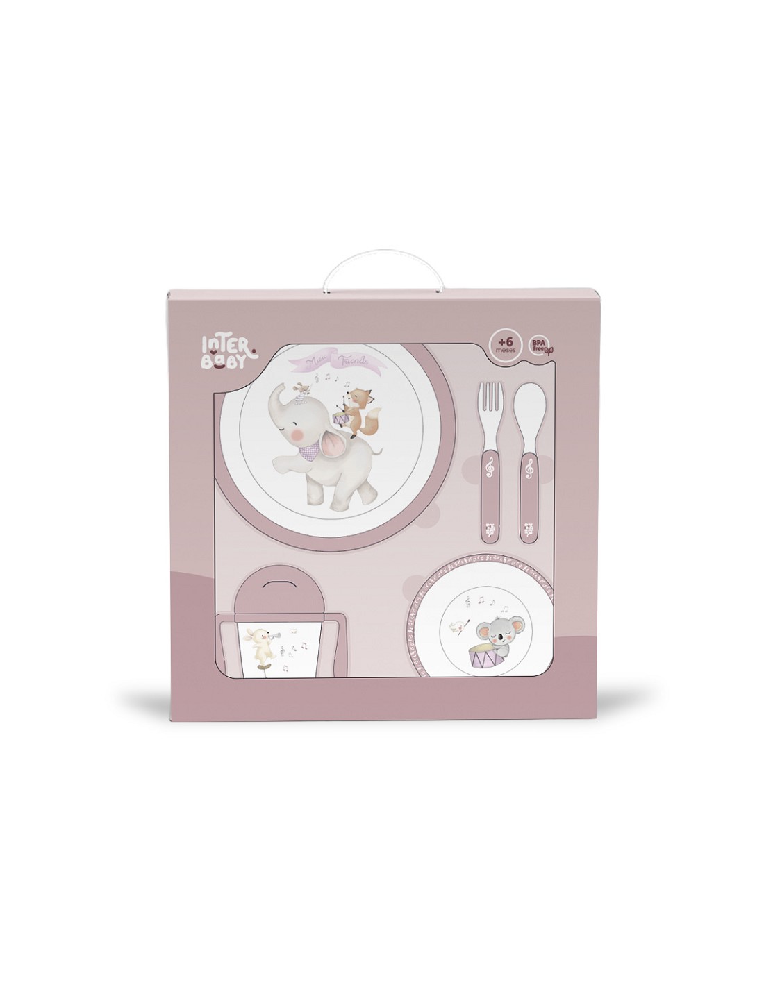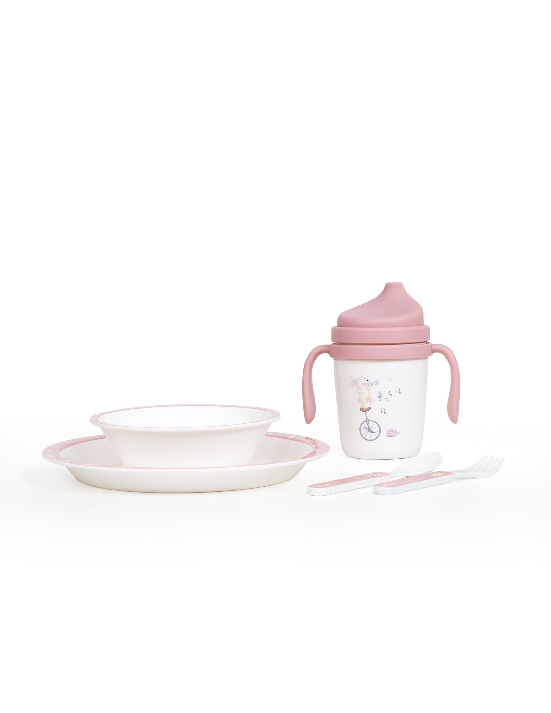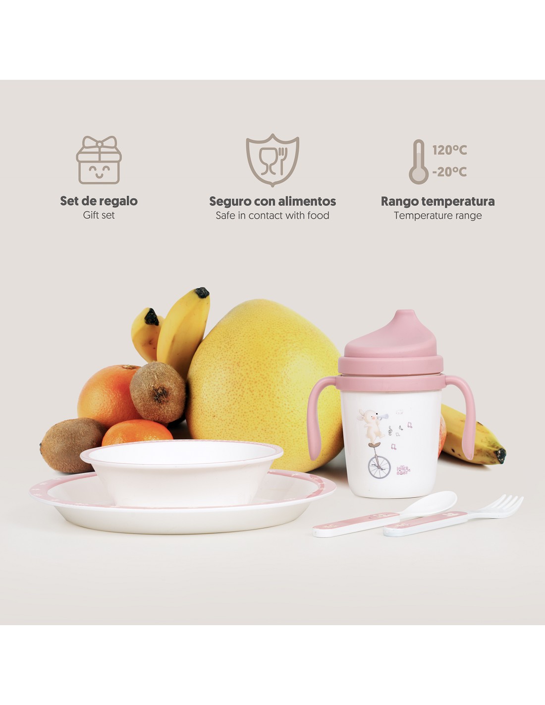 Vajiila de aprendizaje apata para microondas y lavavajillas. Pilipropileno libre de Bisfenol . Apta para temperaturas desde los -20ºC a los 120ºC. Contiene Plato llano, bo, cuchara, tenedor y vaso antigoteo de aprendizaje. Apto para mayores de 6 meses de edad.